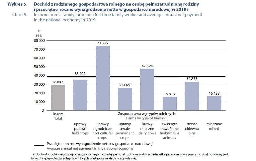 Z raportu Rolnictwo, opublikowanego w lipcu przez GUS wynika, że przeciętny dochód na osobę pełnozatrudnioną w rodzinnych gospodarstwach rolnych w 2019 r. wzrósł o 5,6% w stosunku do roku poprzedniego, ale nadal jest niższy od przeciętnego rocznego wynagrodzenia netto o 26,3%.