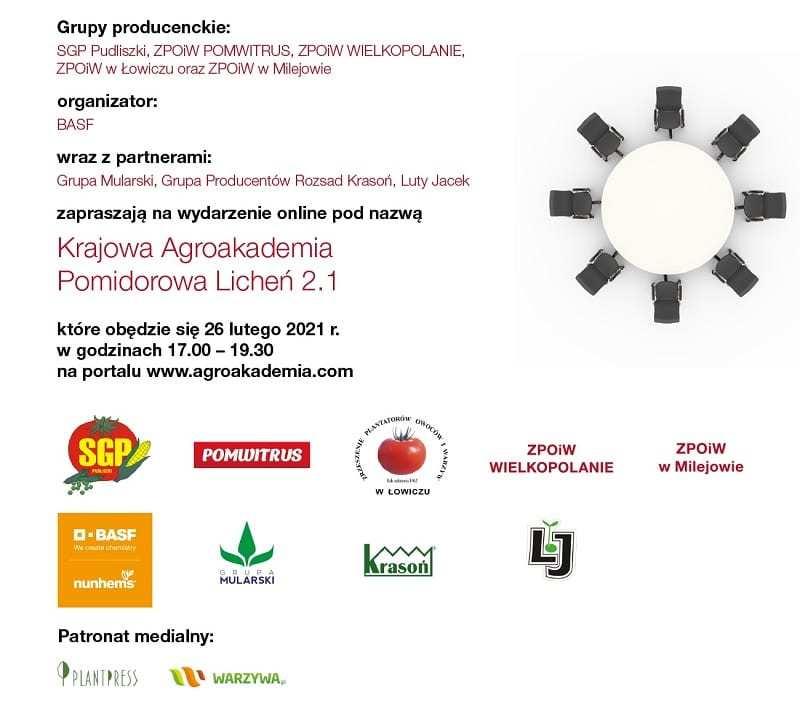 Grupy producenckie: SGP Pudliszki, ZPOiW POMWITRUS, ZPOiW WIELKOPOLANIE, ZPOiW w Łowiczu oraz ZPOiW w Milejowie i firma BASF Nunhems wraz z partnerami zaprasza w piątek 26 lutego 2021 roku wszystkich zainteresowanych produkcją pomidorów dla przetwórstwa na tegoroczną edycję Krajowej Agro Akademii Pomidorowej.