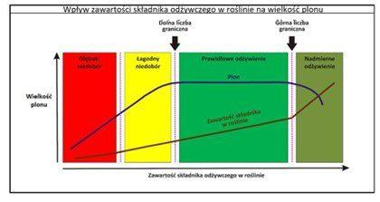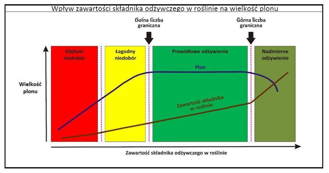 Sprawdzenia jaka jest zawartość składników odżywczych w liściach. Wyniki porównujemy do liczb granicznych, które otrzymujemy wraz z raportem. Tutaj bardzo ważny jest bowiem że nie tylko niedobór ale i nadmiar określonego składnika może mieć negatywny wpływ na wzrost roślin czy jakość plonu (rys. 1). Dzięki takim badaniom monitorowane jest odżywianie roślin i dokonywanie korekt, na przykład przy niedoborze danego składnika. Często może okazać się jednak, że roślina ma wystarczającą ilość danego składnika i nie jest wymagane dodatkowe nawożenie czy to doglebowe czy dolistnie.