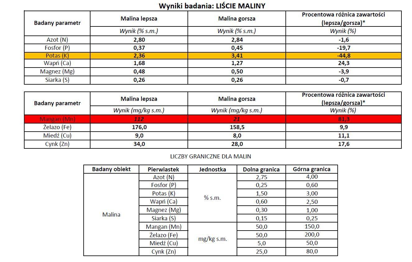 Rys. 2 Wyniki analizy liści zdrowych liści malin w stosunku do liści wykazujących symptomy złego odżywienia