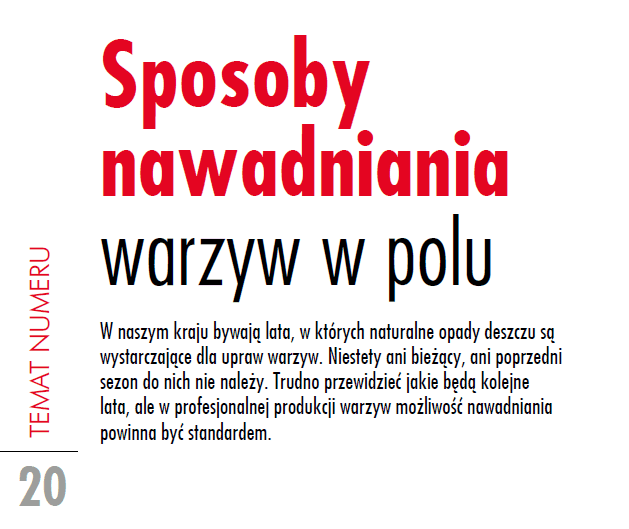 W kolejnym artykule na str. 20 prezentujemy różne sposoby nawadniania warzyw od najpopularniejszego za pomocą deszczowni szpulowej przez linie kroplujące po duże deszczownie mostowe.