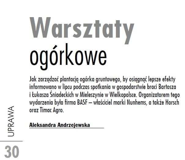 Warsztaty ogórkowe – to tytuł artykułu na str. 30, w którym informujemy jak zarządzać plantacją ogórka gruntowego, by osiągnąć lepsze efekty. Spotkanie odbyło się w gospodarstwie braci Bartosza i Łukasza Śniadeckich w Mieleszynie w Wielkopolsce, którzy mają wieloletnie doświadczenie w uprawie tego warzywa. Organizatorem tego wydarzenia była firma BASF – właściciel marki Nunhems, a także Horsch oraz Timac Agro. Podczas spotkania można było zobaczyć jak wygląda zbiór owoców (zobacz FILM) oraz sortowanie (zobacz FILM).