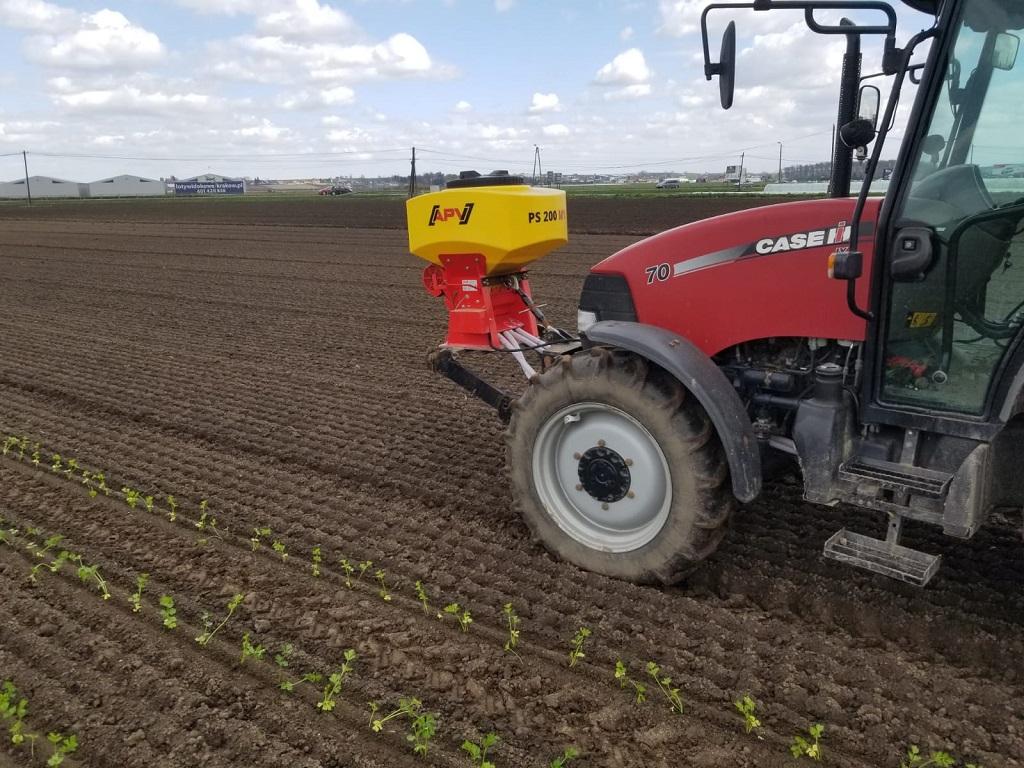 Jak widać na filmie, z przodu ciągnika zamontowany jest zbiornik APV do mikrogranulatu. Podczas sadzenia roślin do gruntu, aplikowany był insektycyd Belem 0,8 MG przeciwko szkodnikom glebowym.