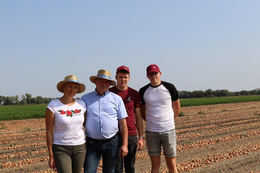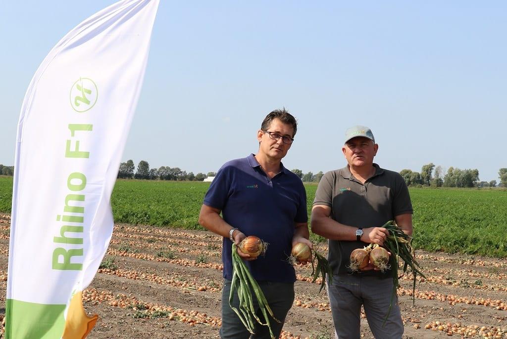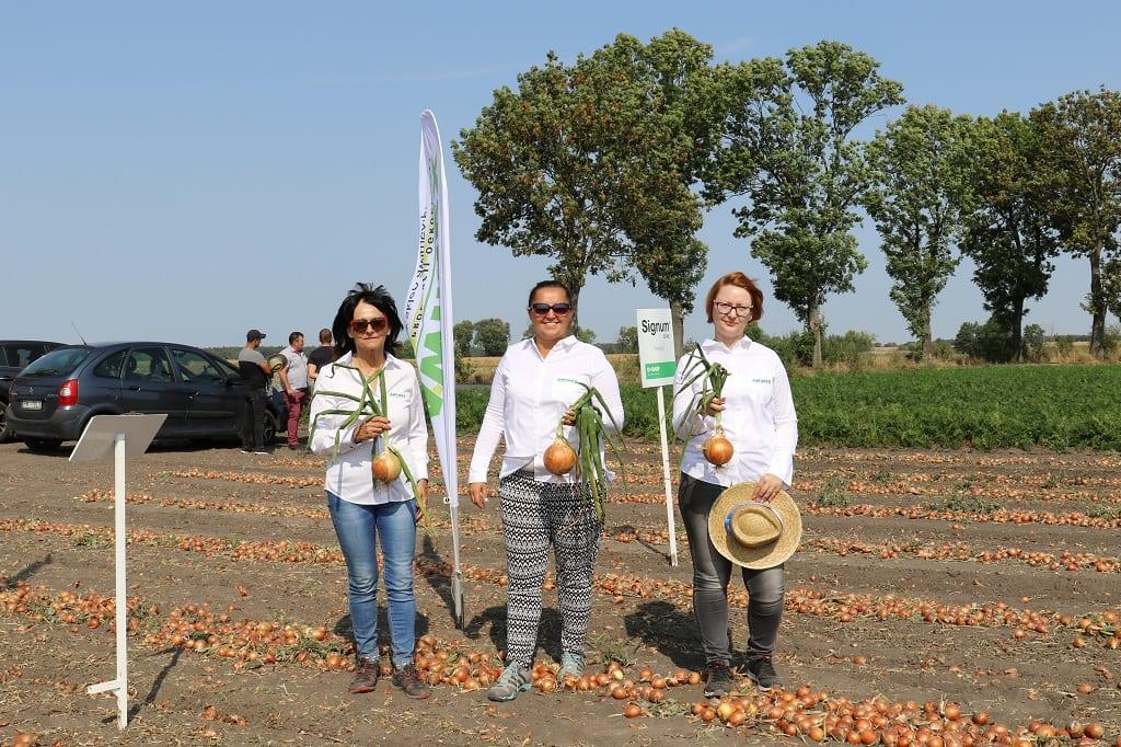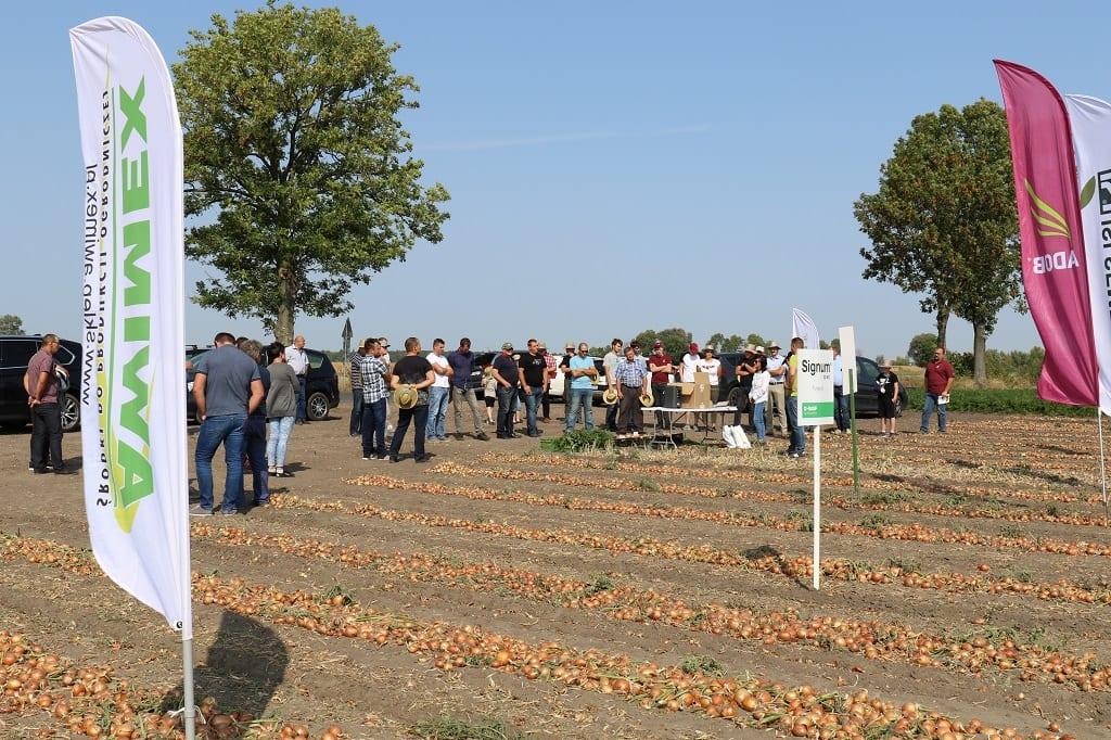 Dariusz Kalemba – gospodarz spotkania - w tym roku uprawia cebulę na 11 ha (dominuje z siewu wiosennego, ale co roku wysiewa również cebulę zimującą – odmianę Wolf F1). Na polu, na którym odbyło się spotkanie, można było zobaczyć trzy odmiany z oferty firmy Hazera: Rhino F1, Euresco F1 i Dormo F1 oraz odmianę z firmy Bejo Zaden – Hybelle F1. Stanowisko pod cebulę było zaorane dopiero wiosną, ze względu na nadmierną wilgotność gleby jesienią, natomiast od początku wiosny panowała susza. W sumie na tym polu odnotowano tylko ok. 60 mm naturalnego opadu. Dodatkowo raz pole było nawadniane (dawką ok. 20 mm). Na polu wystąpiło zachwaszczenie wtórne, ale na tyle późno, że nie stanowiło ono konkurencji dla dorastającej cebuli. Cebula nie była zbyt duża, ale jak na tegoroczne warunki pogodowe plantator może być zadowolony z osiągniętego efektu.