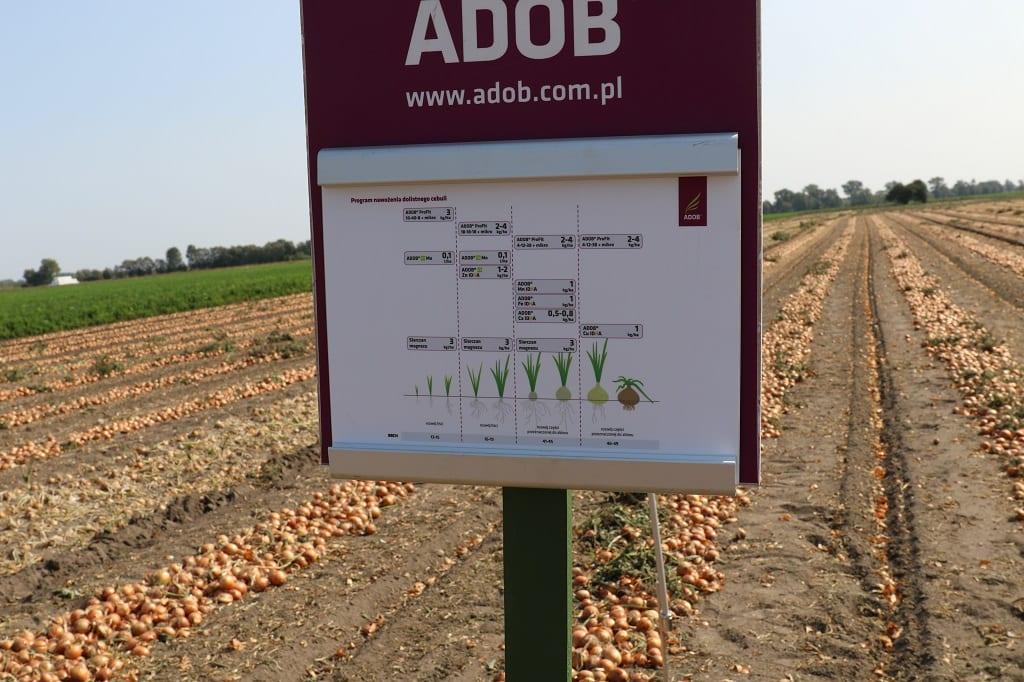 Krzysztof Kuczyński z firmy Adob informował o nawożeniu dolistnym cebuli. Podkreślał, że sposób ten nie może zastąpić nawożenia doglebowego. Jest to tylko zabieg uzupełniający. Cebula ma płytki system korzeniowy, zwłaszcza w tym suchym roku. Program nawozowy firmy Adob bazuje na nawozach wieloskładnikowych serii ProFit oraz na produktach mikroelementowych. Informował on, że w większości gleb Polski stwierdzono postępujące niedobry mikroskładników, które wynikają m.in. z ograniczonego nawożenia organicznego, przede wszystkim za pomocą obornika czy gnojowicy. Spośród mikroskładników, których brakuje w glebach w Polsce to m.in. bor, miedź czy molidben. Na polu wykonano cztery zabiegi dolistne. Zabiegi mikroskładnikami w formie chelatów są skuteczne. Prelegent polecał szczególnie chelat wapnia – Adob Ca IDHA – nawóz bezazotowy, poprawiający zdolność przechowalniczą warzyw. Informował on, że wapń warto również zastosować, gdy rośliny zostaną uszkodzone np. herbicydami. Zabezpieczając dolistnie wapń przyspieszy gojenie się uszkodzeń.