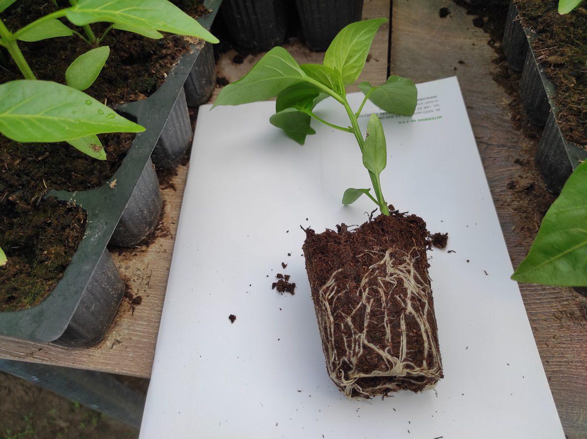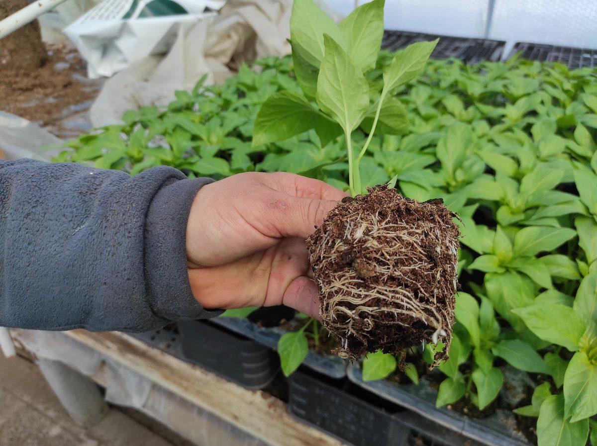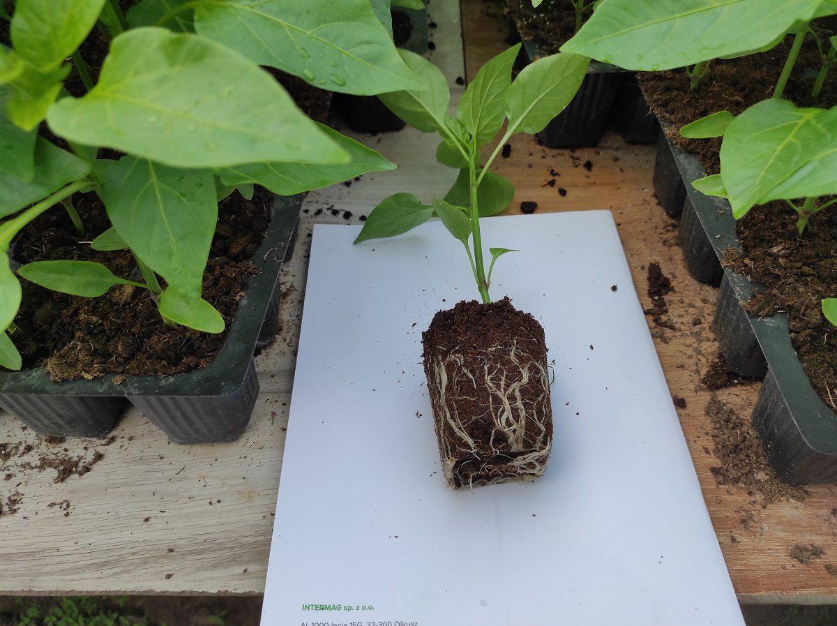 Jak widzimy na zdjęciach, rozsada papryki ma dobrze rozbudowany system korzeniowy, jest krępa i wyrównana. Jak twierdzą producenci, bardzo ważne jest umiejętne zadbanie o rośliny, zwłaszcza na etapie produkcji rozsady. Coraz powszechniejszym staje się stosowanie produktów mikrobiologicznych, zawierających zestaw bakterii, grzybów mikoryzowych, grzybów ryzosferowych oraz drożdży, silnie stymulujących wzrost i rozwój roślin oraz zwiększających biologiczną aktywność gleby.