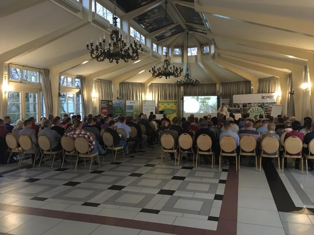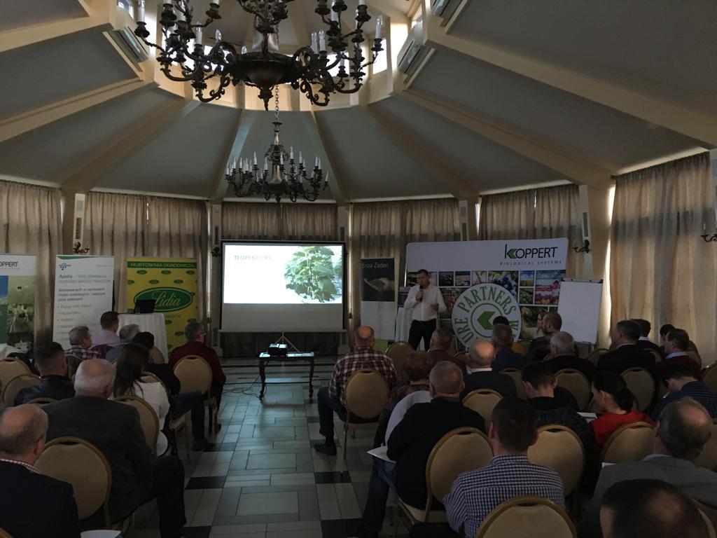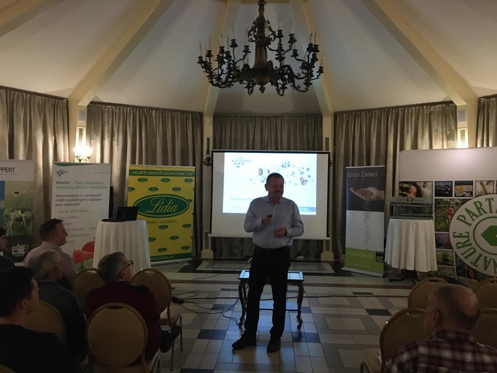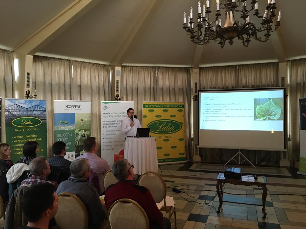 Dzisiaj (28 listopada) w Tłokini Kościelnej odbyło się spotkanie poświęcone uprawie ogórków i pomidorów pod osłonami. Firmy Lidia Horti Logistic, Enaza Zaden, Azelis i Koppert Polska gościły ponad osiemdziesięciu ogrodników zainteresowanych tematyką zagrożenia jakie zaczyna stanowić w produkcji ogórków nowy wirus CGMMV, o którym informował Mateusz Janas z firmy Enaza Zaden oraz tematyką uprawy tego warzywa zaprezentowaną przez Piotra Pietrzaka. O zaletach stosowania szczepionki V10 chroniącej uprawy pomidora przed dwoma agresywnymi szczepami wirusa mozaiki pepino oraz o ofercie innych produktów biologicznych z portfolio Koppert Polska mówiły Sabina Łukaszewicz i Maria Lis. Mieczysław Głaczkowski poinformował, na które nawozy do uprawy pod osłonami z oferty firmy Azelis warto postawić w nadchodzącym sezonie.