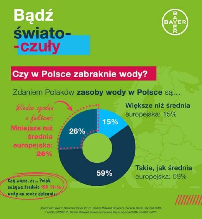 Z badania „#Barometr Bayer” wynika, że aż 59 proc. z nas obawia się deficytu wody w naszym kraju; strach ten jest szczególnie duży na wsi (64 proc.). Jedynie 26 proc. respondentów zdaje sobie sprawę z faktu, że zasoby wodne Polski są niższe od średniej europejskiej (przy czym świadomość rośnie z wiekiem). 95 proc. Polaków (przynajmniej umiarkowanie często) podejmuje działania związane z oszczędzaniem wody. Również ta skłonność rośnie wraz z wiekiem. Zarazem dostrzegamy fakt, że w Polsce poprawiła się jakość wody pitnej (64 proc.).