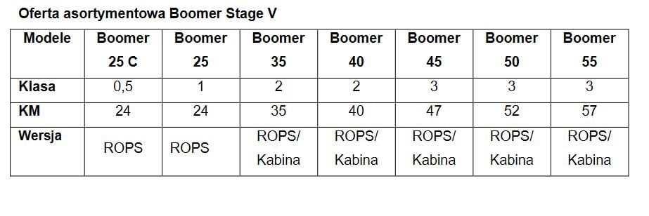Nowa seria Stage V zapewnia lepsze osiągi i większą wydajność, a także znaczne korzyści dla operatora, obejmujące większy wybór modeli, dostępnych z wyróżniającą się wysokim komfortem kabiną. Poszerzona oferta asortymentowa i nowe modele Seria Boomer została poszerzona o dwa nowe modele klasy 3: Boomer 45 o mocy 47KM oraz Boomer 55 o mocy 57KM, pokrywające segment mocy w przedzialedo60KM. Oferta nowych mocy dodatkowo zwiększa wszechstronność ciągników Boomer, mogą bowiem one z większą łatwością sprostać najbardziej wymagającym zadaniom, typowym dla tej gamy maszyn –od koszenia po transport i inne prace, takie jak lekkie prace uprawowe czy zamiatanie i odśnieżanie ulic.