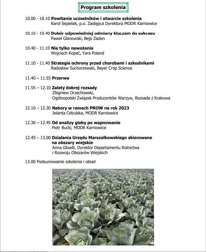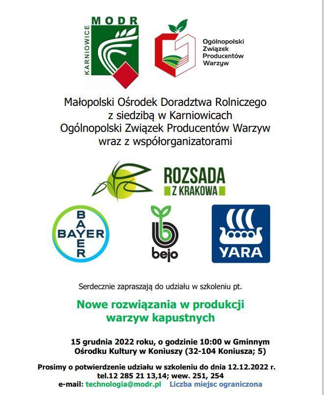 Małopolski Ośrodek Doradztwa Rolniczego z siedzibą w Karniowicach i Ogólnopolski Związek Producentów Warzyw wraz z współorganizatorami zapraszają do udziału w szkoleniu pt.: "Nowe rozwiązania w produkcji warzyw kapustnych".