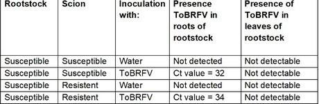 Dwanaście dni po zaszczepieniu zmierzono koncentrację ToBRFV w roślinie. Stwierdzono, że podatna odmiana wykazywała podobną koncentrację wirusa ToBRFV niezależnie od tego, czy była zaszczepiona na podkładce podatnej czy odpornej. Stężenie wirusa w roślinie było wysokie, a wkrótce potem pojawiły się pierwsze objawy.