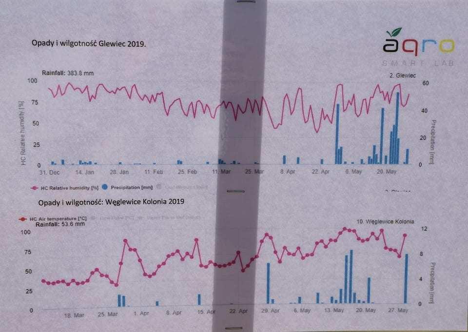 Dzięki uprzejmości firmy AgroSmartLab i pana Mirosława Maziarki zaprezentowano karty pól oraz warunki agrometeorologiczne, które omówił Wojciech Kopeć. Stacja pomiarowa, zamontowana na polu państwa Lipowieckich, wskazywała od 31 grudnia 2018 r. do 20 maja 2019 r. aż 383,8 mm opadu. Dla porównania w miejscowości Węglewice Kolonia k. Łęczycy, suma opadów od 18 marca do 27 maja 2019 r. wynosiła 53,6 mm opadu.