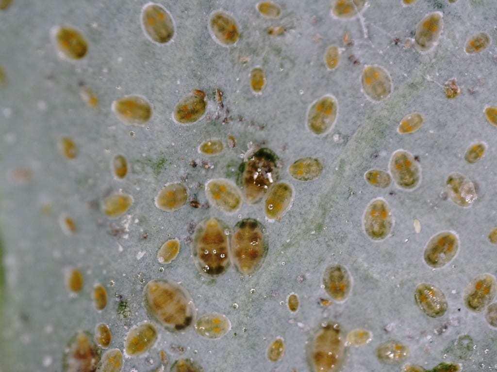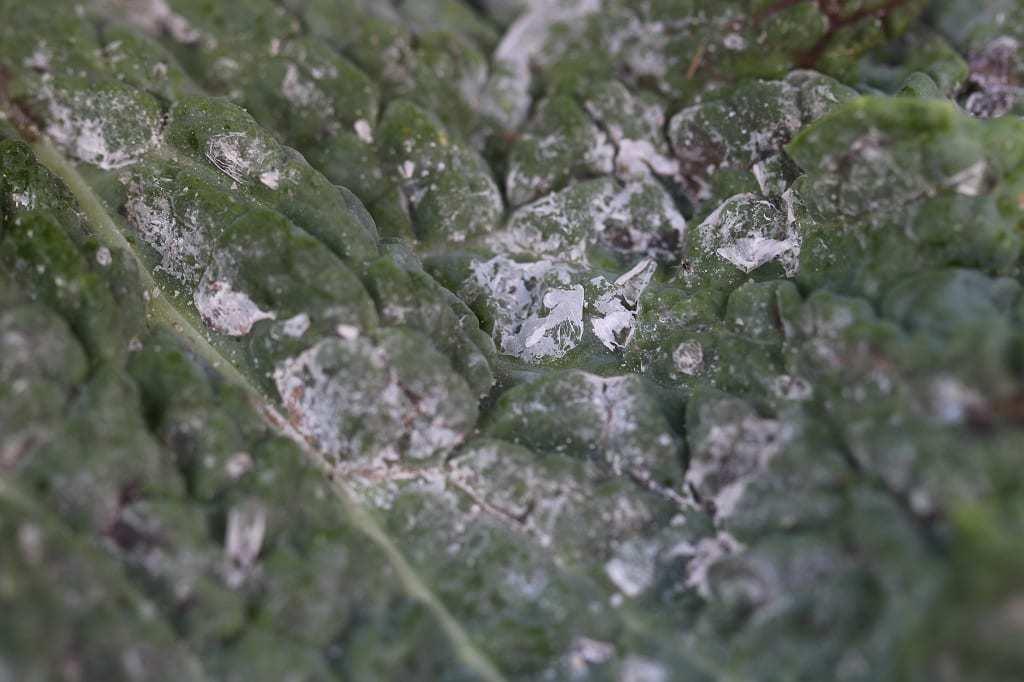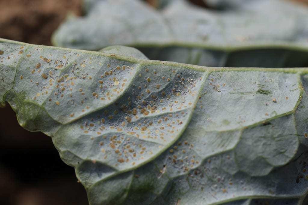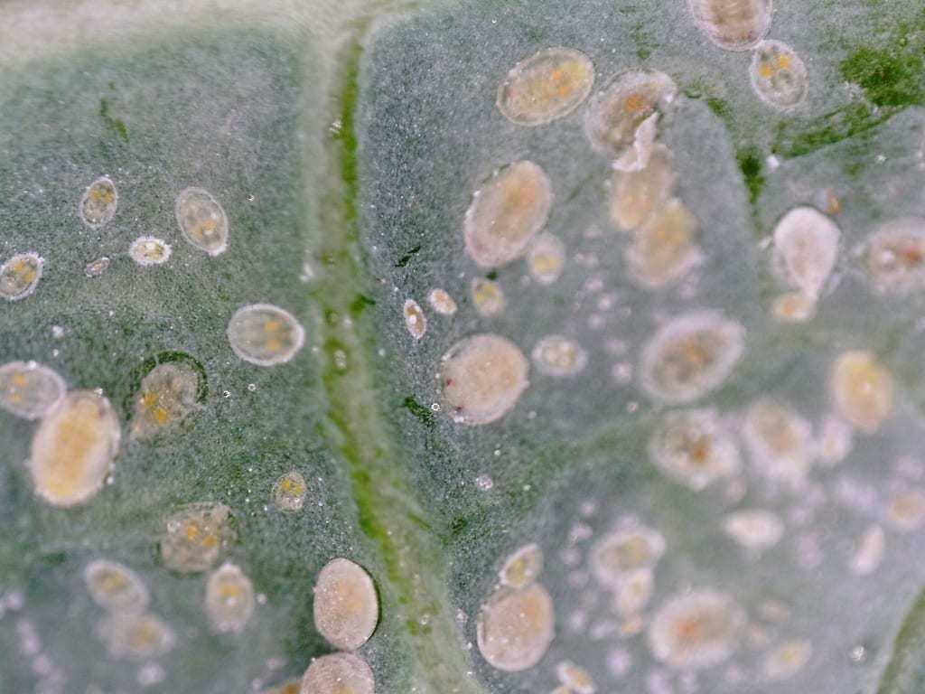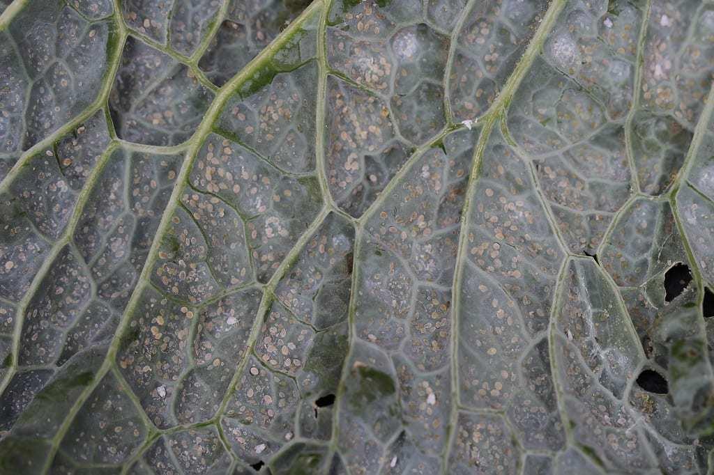 Była to pozostałość po rosie miodowej wydzielanej przez aktywne (żerujące) mączliki (fot. 3). Do słodkich kropel wydzielanych na powierzchnię rośliny przykleja się nalot woskowy pokrywający ciało mączlików. Z czasem krople łączą się w duże „agregaty” (fot. 4). Opadają one na niżej położone liście i tam odparowują. Pozostaje lepka „skórka”, która z podmuchami wiatru może się przemieszczać na całą powierzchnię pokarbowanego liścia kapusty włoskiej. Na wydzielinie rozwijają się grzyby sadzakowe, przez co warzywo jest dodatkowo zanieczyszczone (fot. 5) i zupełnie nieapetyczne.