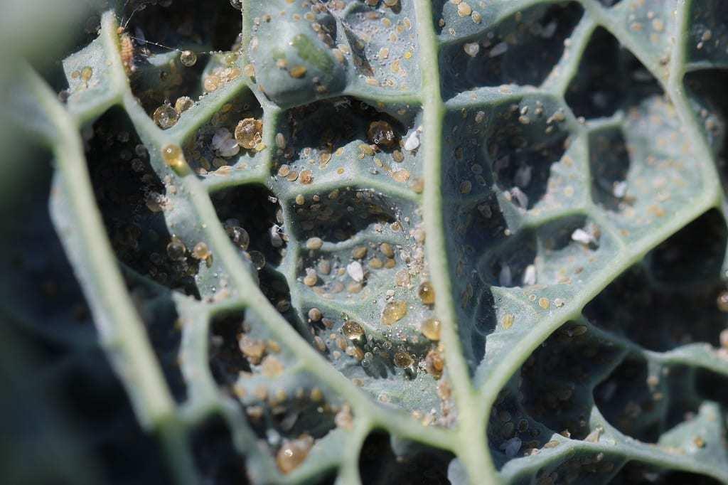 Podobnie sytuacja wygląda w przypadku jarmużu, ale na nim szkodnik przybiera nieco ciemniejsze zabarwienie. Trochę też inaczej się zachowuje. Otóż obserwowane, starsze larwy (w fazie poczwarki) okryte były dodatkowo warstwą rosy miodowej (fot. 6), być może ta osłonka ma zapobiegać wysychaniu.