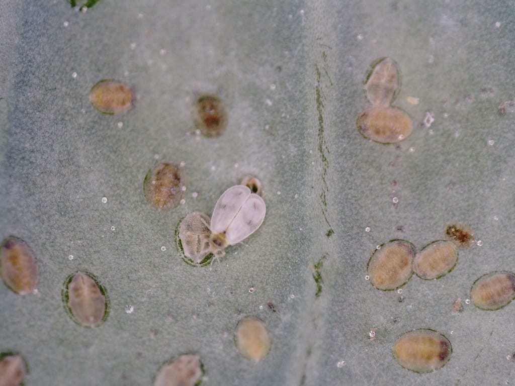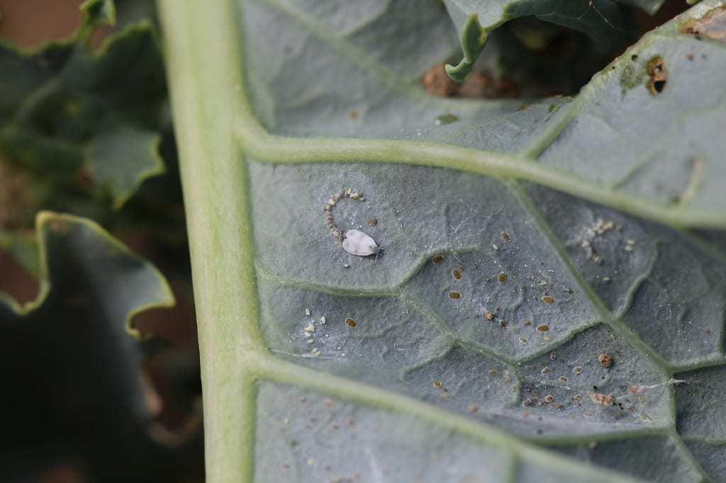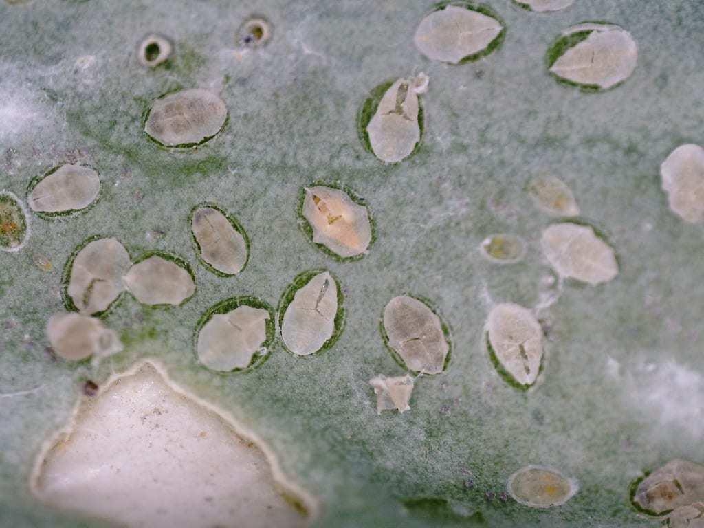 Jednocześnie na wszystkich ww. warzywach znajduje się populacja szkodnika, którą stanowią wszystkie stadia rozwojowe: jaja (raczej odporne na działanie środków ochrony roślin, fot. 9), larwy (również odporne na insektycydy), poczwarki i wychodzące z poczwarek osobniki dorosłe (fot. 10). Pozostałości po poczwarce przytwierdzone do skórki liścia (fot. 11) zanieczyszczają go dodatkowo.