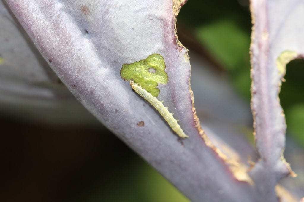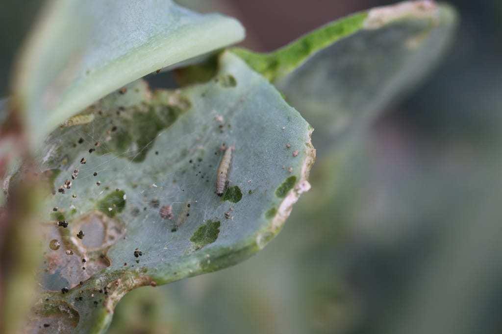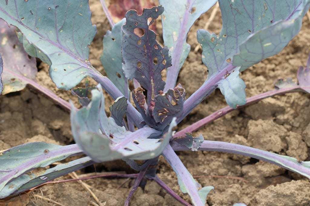 Tantniś krzyżowiaczek dokonuje dzieła. Na objeżdżanych polach, należących do różnych ogrodników, sytuacja była bardzo podobna. Kilkanaście gąsienic obecnych na jednej roślinie powoduje nieodwracalne szkody (fot. 1), włącznie ze zniszczeniem stożka wzrostu (fot. 2). Trzeba mieć świadomość, że tak liczna populacja tantnisia szkodzić będzie kolejnym nasadzeniom do późnej jesieni.