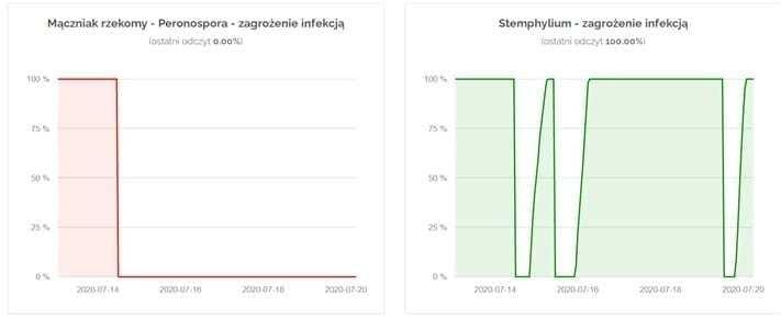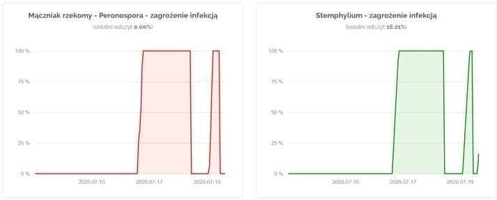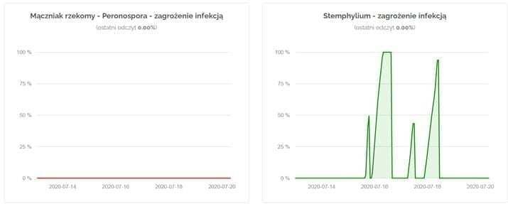 Wykresy modeli chorobowych pokazują wysokie zagrożenie oraz silne infekcje chorób grzybowych w uprawach cebuli. Obecna sytuacja fitosanitarna wymaga zastosowania produktów działających interwencyjnie na mączniaka rzekomego oraz zgniliznę szyjki cebuli. Objawy Stemphylium vesicarium są powszechnie spotykane na plantacjach.