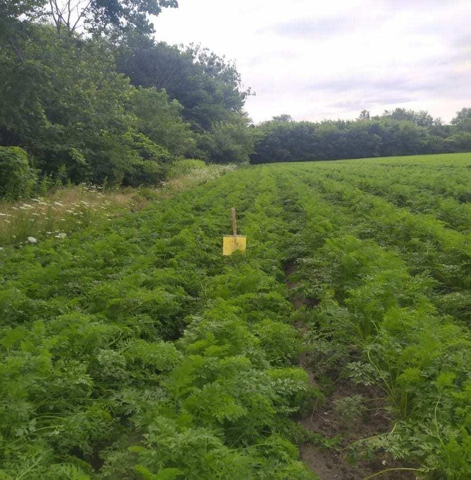 Szkodniki warzyw korzeniowych. Od II dekady lipca 2020 prowadzimy kontrolę odłowu much II pokolenia połyśnicy marchwianki (Chamaepsilla rosae) poprzez wystawienie tablic lepowych żółtych na polu w uprawie marchwi w fazie BBCH 44-46.
