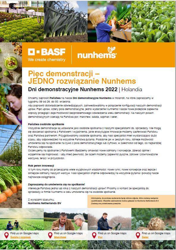 Chcemy zaprosić Państwa na nasze Dni demonstracyjne Nunhems w Holandii, na które zapraszamy w tygodniu 39 od 26. do 30. września. Aby poprawić doświadczenie odwiedzających, zainwestowaliśmy w połączenie konfiguracji naszych demonstracji upraw. Pięć upraw, cztery pola demonstracyjne, jedno wydarzenie Nunhems! Nasze nowe podejście zapewnia większy przegląd i daje możliwość bezproblemowego odwiedzenia wielu demonstracji. Na naszych polach demonstracyjnych czekają na Państwa por, marchew, sałata, szpinak i seler.