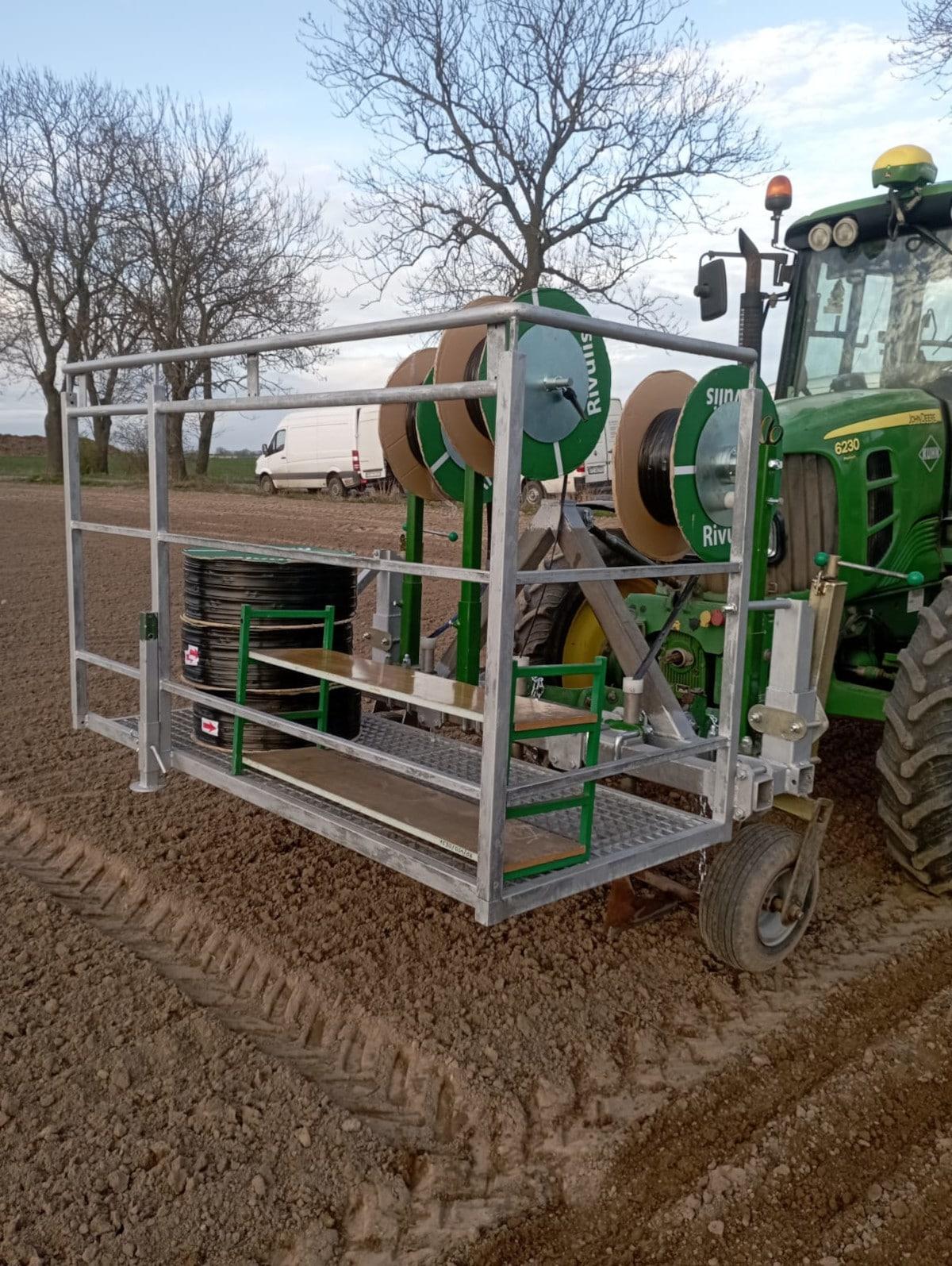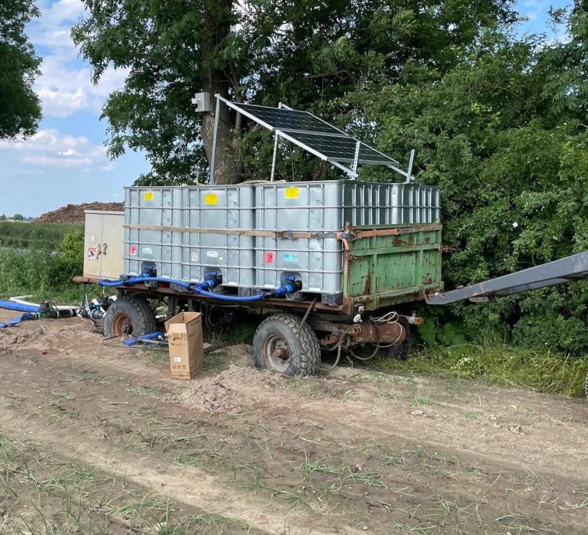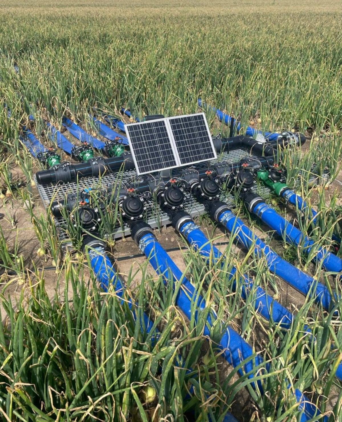 Całą powierzchnię uprawy cebuli nawadniano z jednej studni głębinowej, dzięki podzieleniu plantacji na sekcje. Rozkładanie taśm (w Łagwach zastosowano taśmy D1000 firmy Rivulis, które rozłożono pod powierzchnią gleby) i instalacja systemu są pracochłonne, ale w sezonie nawadnianie kroplowe jest bardzo wygodnym rozwiązaniem i eliminuje wszelkie niedogodności związane z użytkowaniem deszczowi. Szczególnie, że sterowanie jego pracą odbywało się za pośrednictwem aplikacji w telefonie. Aby było to możliwe, stacja z elektrozaworami na polu wyposażona była w mały panel słoneczny oraz sterownik z kartą SIM. Również pompa dozująca zasilana była energią z dwóch paneli fotowoltaicznych.