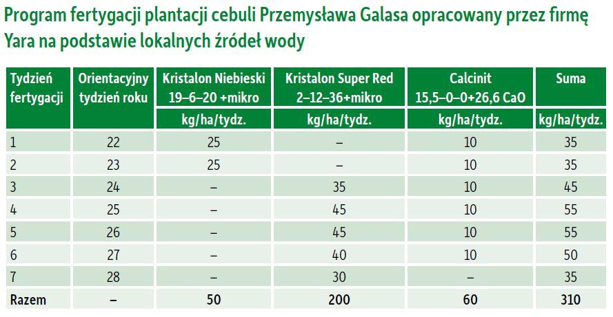 Stężoną pożywkę do fertgacji przygotowywano w mauserach ustawionych na przyczepie. Do każdego 1000-litrowego zbiornika wysypywano 200 kg nawozów tworząc bardzo stężoną pożywkę (20%). Były pewne obawy o to, czy przy tak dużym zagęszczeniu pożywki nawozy dobrze się rozpuszczą, okazały się one jednak bezzasadne. Pierwsze nawadniania wykonano czystą wodą. Fertygację rozpoczęto od fazy 4. liścia właściwego, co wypadało ok. 22.-23. tygodnia roku według programu przedstawionego w tabeli. Program ten pozwolił uzyskać w minionym roku plon dobrej jakości cebuli do przechowywania na poziomie 64 t/ha.