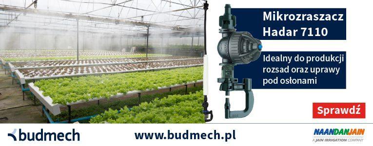 Produkcja roślin zielonych to wysokie koszty inwestycyjne. Szklarnie i tunele poprawiają warunki uprawy sałaty i innych roślin zielonych. Wybór optymalnego systemu nawadniania i efektywne zarządzanie nim ma kluczowe znaczenie dla sukcesu inwestycji. W przypadku upraw sałaty pod osłonami, dobrym rozwiązaniem jest zastosowanie mikrozraszaczy Hadar 7110 dostępnych w ofercie firmy Budmech. Hadar to mikrozraszacz pracujący w pozycji odwróconej. Montowany jest na wężyku pod sklepieniem tunelu lub szklarni. Jest wykorzystywany do intensywnego nawadniania lub chłodzenia roślin. W czasie upałów pozwala na nawadnianie pulsacyjne w celu zachowania wysokiej wilgotności. Dzięki zastosowaniu antykapacza LPD możliwe jest jednoczesne uruchomienie i zamknięcie instalacji w jednym momencie, bez konieczności opróżniania instalacji między cyklami nawadniania. Woda zostaje w rurach i nie wycieka przez zraszacze niszcząc podłoże i powodując powstawanie kałuż. Zaletą mikrozraszacza Hadar jest drobna kropla i niska intensywność opadu, co eliminuje ryzyko mechanicznego uszkodzenia roślin oraz negatywnego wpływu nawadniania na strukturę gleby.
