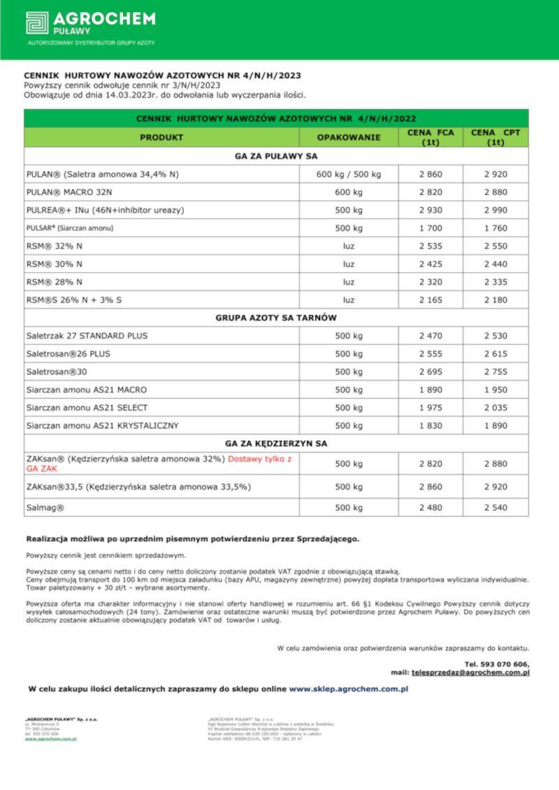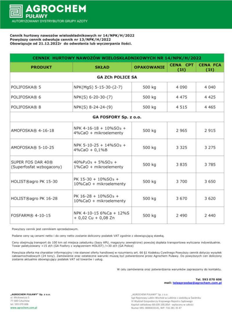 Poniżej przedstawiamy aktualny cennik nawozów opublikowany przez Agrochem Puławy. Obowiązuje on od dnia 14 marca do odwołania lub wyczerpania zapasów. Widoczne w nim ceny odnoszą się rzecz jasna do zakupu hurtowego, więc koszt surowca w składach może okazać się nieco wyższy.