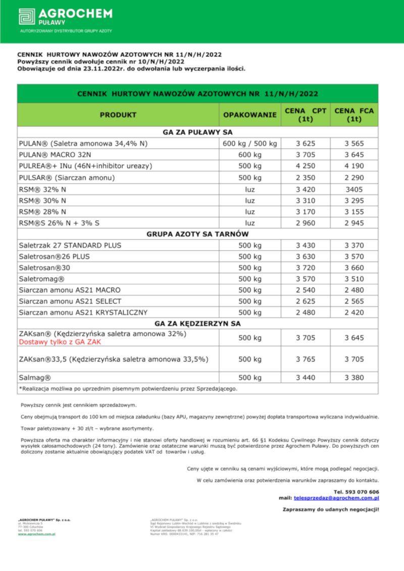 Poniżej prezentujemy aktualne ceny nawozów azotowych opublikowane przez Agrochem Puławy w dniu 23 listopada. Tyczą się one zakupu hurtowego, czyli 24 ton. Tak więc, należy się liczyć z tym, iż na składach mogą okazać się one wyższe.