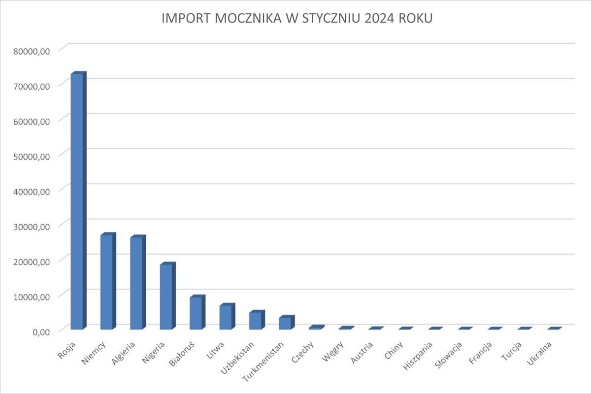 Lider, jeśli chodzi o import mocznika do Polski, pozostaje niezmienny. W styczniu 2024 roku najwięcej surowca sprowadziliśmy bowiem z Rosji. Co ciekawe, skala importu znacząco się zwiększyła, jeśli spojrzymy na dane z poprzednich miesięcy. W styczniu do Polski napłynęło bowiem 72,78 tys. ton mocznika. Należy przy tym zaznaczyć, że Rosja wciąż okazuje się największym dostawcą owego surowca, a kolejne kraje na liście pozostają daleko w tyle.
