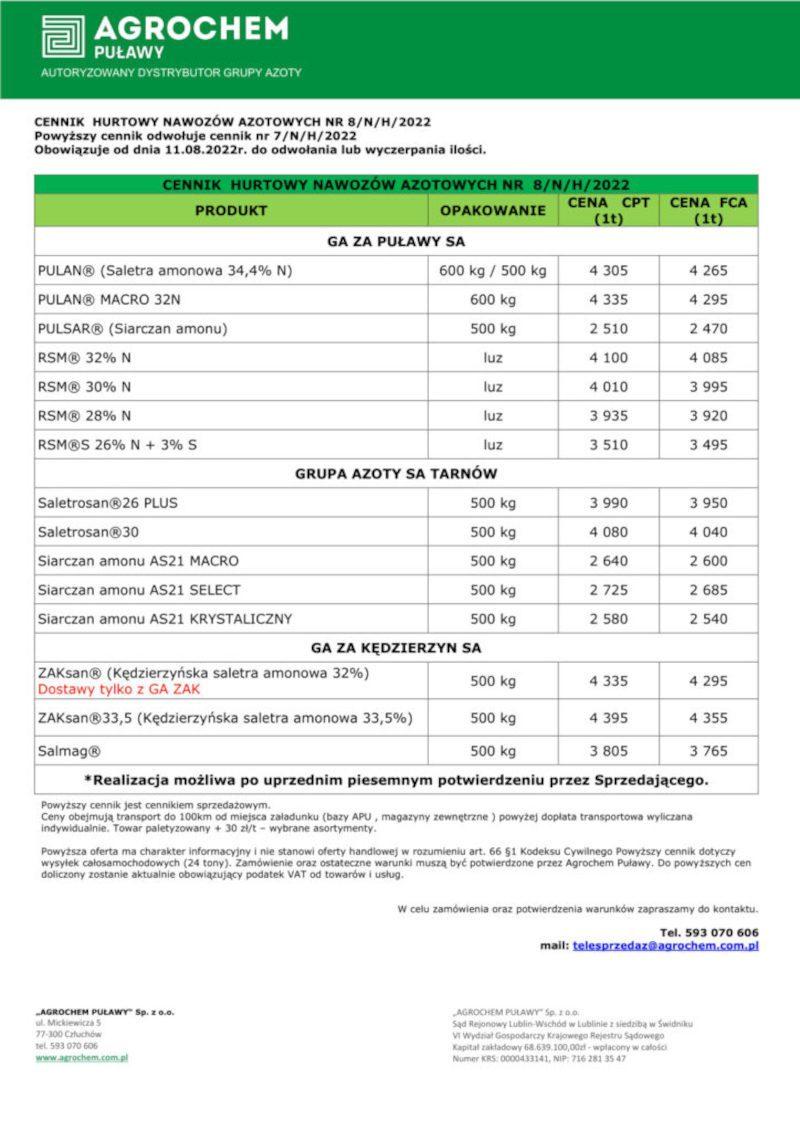 Poniżej prezentujemy aktualny cennik nawozów azotowych opublikowany przez Agrochem Puławy. Ceny w nim widoczne obowiązują od 11 sierpnia. Należy wziąć również pod uwagę, że są to stawki w hurcie, co oznacza, że w składach będą one jeszcze wyższe…W ramach przypomnienia, poprzednia aktualizacja cennika nawozowego miała miejsce 27 lipca.