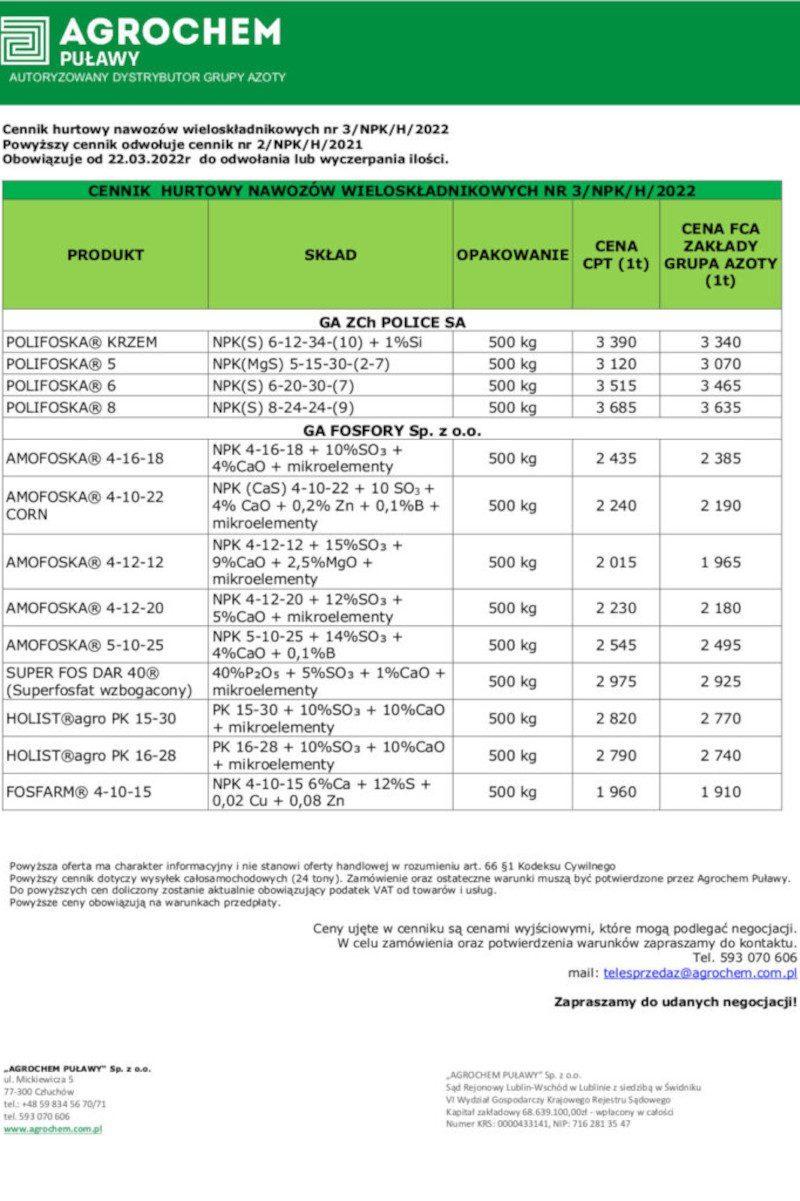 Poniżej przedstawiamy aktualne ceny nawozów wieloskładnikowych opublikowane przez Agrochem Puławy. Naprawdę żałujemy, że to nie 1 kwietnia…