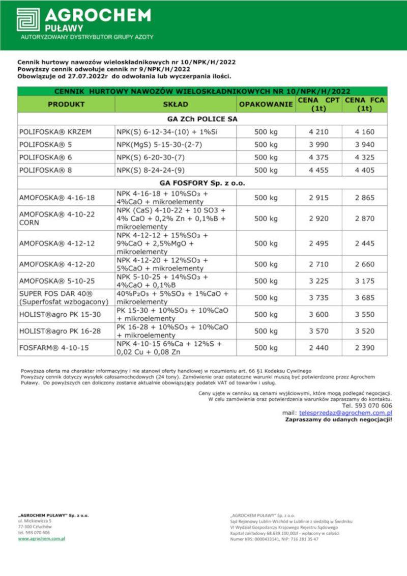 Okres, który minął od poprzedniej publikacji cennika nawozów wieloskładnikowych był nieco dłuższy niż w przypadku nawozów azotowych. Ceny utrzymywały się bowiem na tym samym poziomie od 21 czerwca bieżącego roku. Niemniej, wraz z kolejnymi zmianami w cenniku nawozów azotowych, które miały miejsce 27 lipca, naszym oczom ukazała się również aktualizacja cen nawozów wieloskładnikowych. Stawki co prawda nie zwiększyły się o kolosalne sumy, jednak biorąc pod uwagę aktualne koszty produkcji, każda złotówka ma znaczenie…