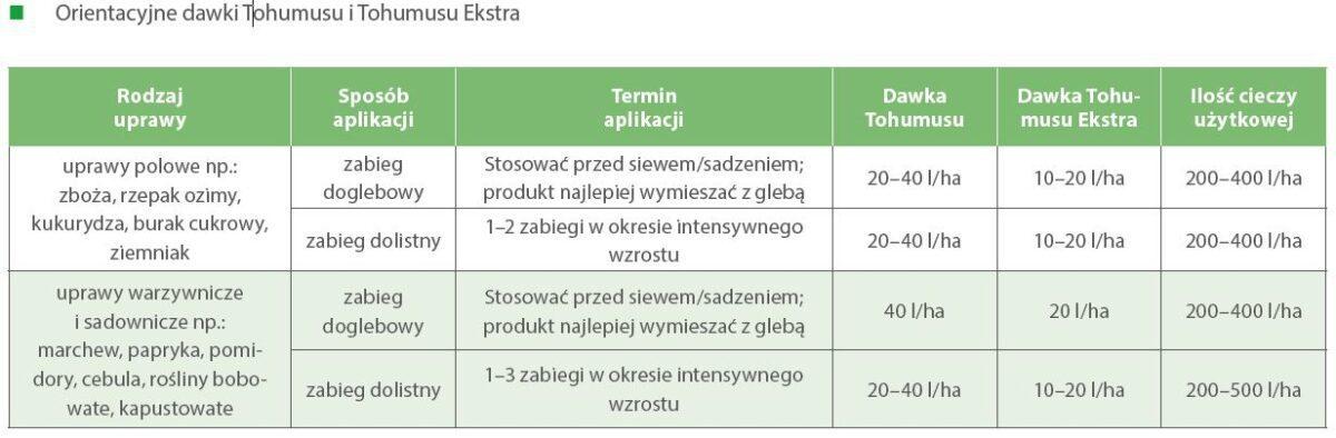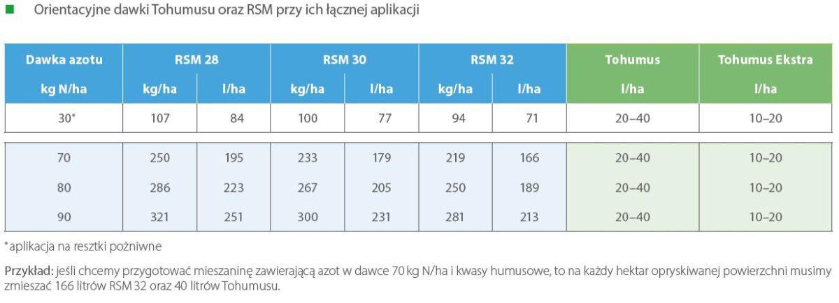 Rekomendowana przez Grupę Azoty dawka Tohumusu wynosi: 20–40 l/ha, natomiast dla Tohumusu Ekstra zawiera się w prze- dziale od 10 do 20 l/ha, zarówno przy aplikacji jako samodzielny produkt, jak również przy łącznej aplikacji z RSM.
