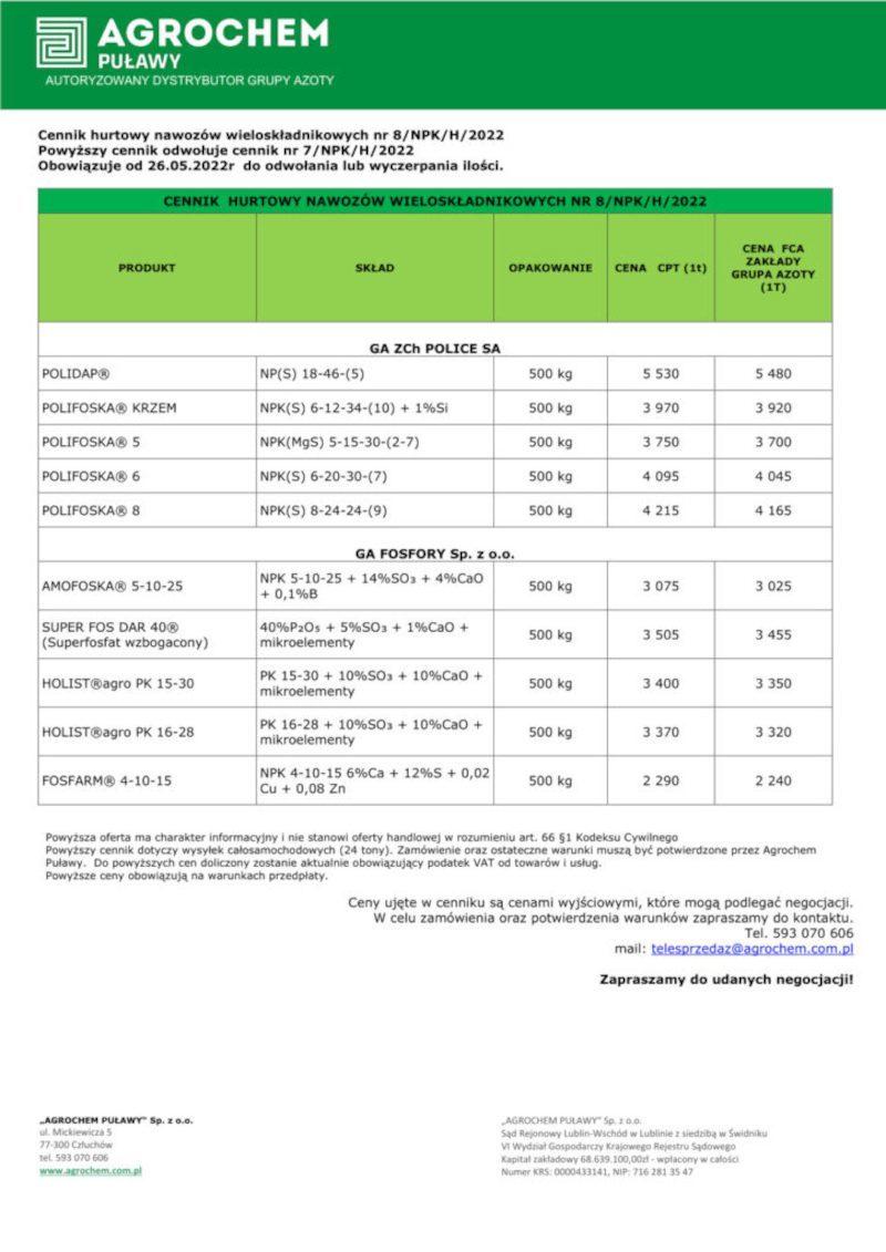 Identycznie jak w przypadku poprzednich cenników, podawane stawki dotyczą ilości hurtowych – 24 tony, więc korzystając z usług okolicznych składów nawozowych możemy spodziewać się dodatkowych marż, co dla nas oznacza jeszcze wyższe ceny niż te podane przez zakład. Cennik obowiązuje od 26 maja do odwołania lub wyczerpania zapasów.
