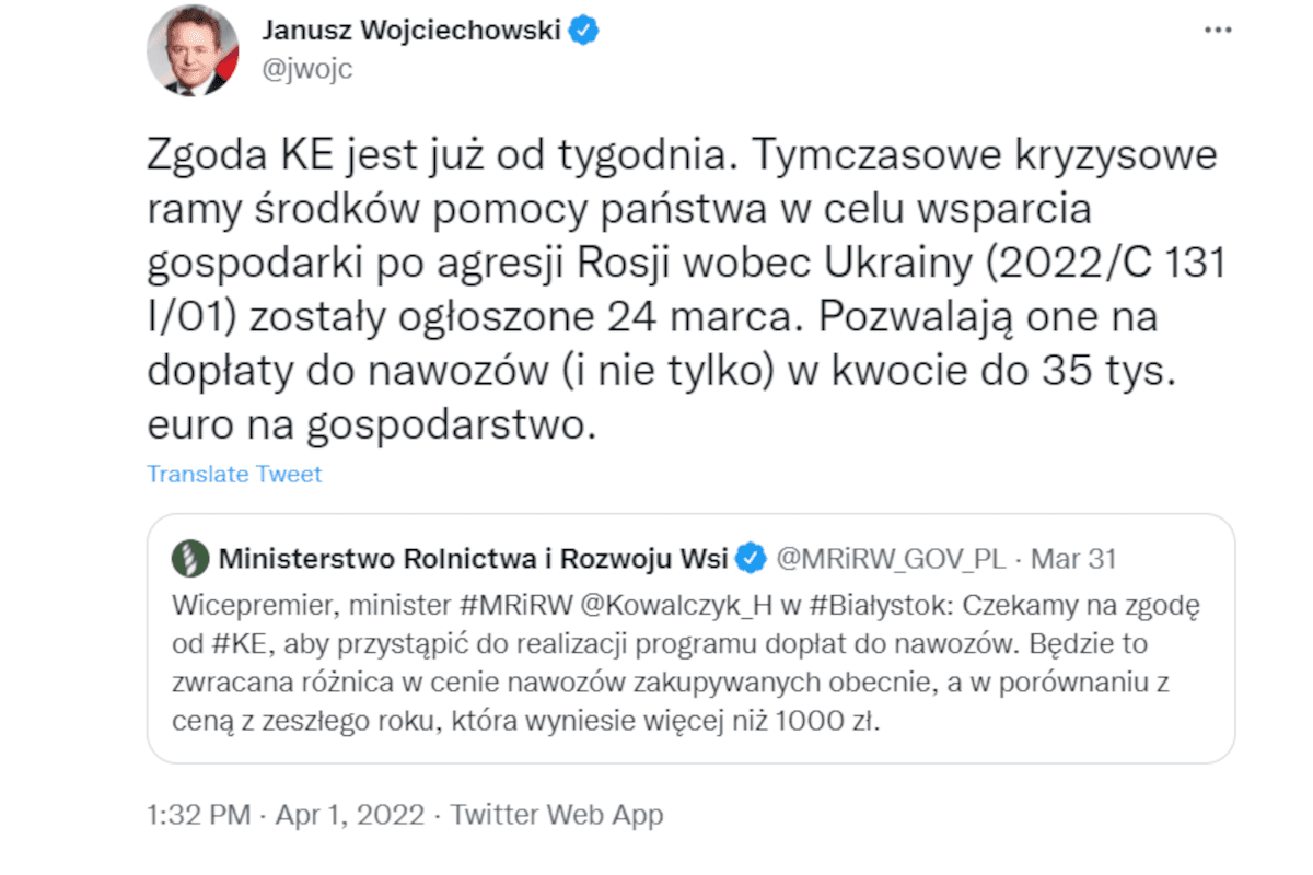 Tymczasem – jak informuje Janusz Wojciechowski na swoim twitterze, pomoc dla rolników została zaakceptowana przez Komisję Europejską już dużo wcześniej. Na jedno gospodarstwo możliwe jest wsparcie rzędu 35 tys. euro, które może być przeznaczone właśnie na wspomniane dopłaty do nawozów, ale nie tylko. Tak więc, resort rolnictwa ma otwartą drogę do omawianych dopłat. Pozostaje się zastanawiać na co jeszcze czekamy…