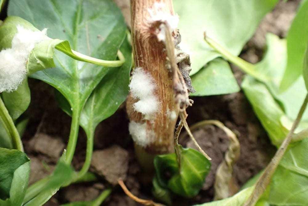 Chorobę łatwo zdiagnozować, trzeba tylko sprawdzać dokładnie nasadę pędu i pierwsze rozgałęzienia (fot. 4), miejsca po usunięciu pierwszego owocu. Zmiana zabarwienia skórki może być sygnałem rozpoczętego procesu chorobowego, ale biała, obfita, gęsta grzybnia pojawiająca się na powierzchni (fot. 5) – to już pewnik.