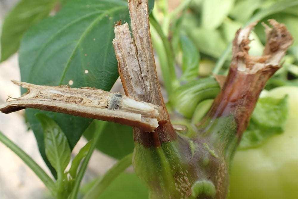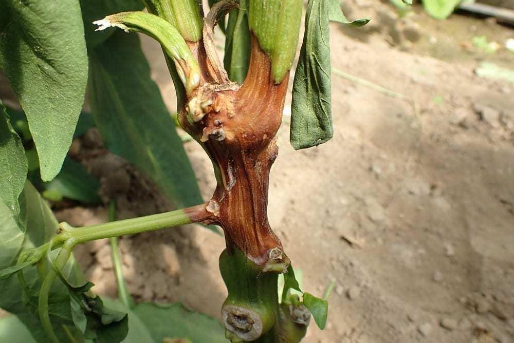 Przewodzenie wody jest zahamowane, transpiracja przebiega – ostatecznie wszystkie części rośliny powyżej chorobowo zmienionego miejsca więdną. Sytuacja jest nieodwracalna. Takiej rośliny już się nie wyleczy. Jest stracona. Należy ją delikatnie wyjąć z gleby (wraz z korzeniami), włożyć od razu do worka i wynieść poza tunel, następnie spalić (nie rozdrabniać, nie wynosić na pryzmy!).