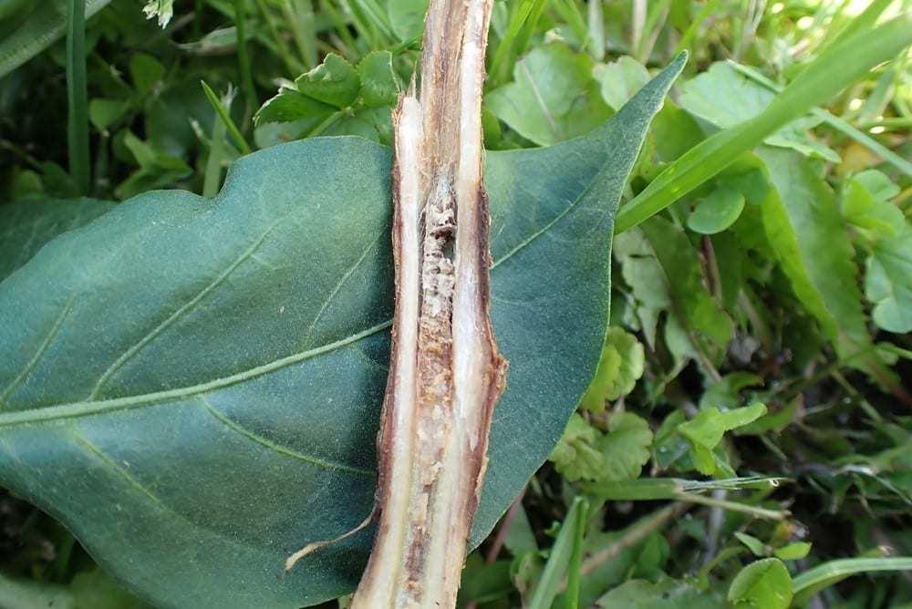 Formy przetrwalne grzyba (sklerocja, fot. 2) po dostaniu się do gleby, właśnie np. podczas bezrefleksyjnego wyłamywania pędów, mogą w niej przetrwać kilka–kilkanaście lat. Mogą też zostać naniesione na nowe stanowisko wraz z wodą opadową czy zawiesiną gleby spływającą podczas obfitego deszczu albo burzy. W warunkach wysokiej wilgotności szybko się uaktywniają, temperatura niewielkie ma znaczenie, oczywiście im cieplej tym lepiej. Grzybnia przerasta do rośliny i poraża ją układowo obejmując coraz wyższe partie pędów. Czasami do porażenia dochodzi w miejscach rozgałęzienia pędu, często świetną drogą infekcji są wszelkiego rodzaju rany, w tym po wyłamaniu pędu. Wysoka wilgotność w tunelu sprawia, że rana nie zasycha, a „odsłonięte” tkanki roślinne długo stanowią pożywkę dla grzyba. Tkanki wewnątrz porażonego pędu z czasem są zupełnie zniszczone (fot. 3).