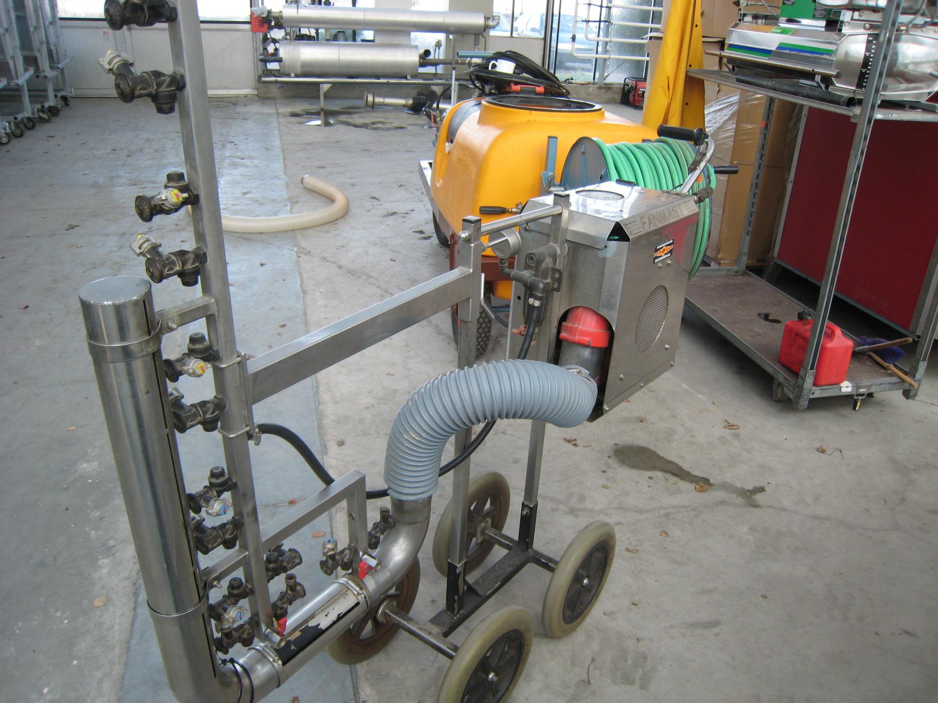 W większych obiektach i w uprawach prowadzonych na płasko bardzo dobrze działają opryskiwacze wózkowe z wężem zakończonym pistoletem opryskowym z rozpylaczem ciśnieniowym. Wyposaża się je dość często w pompy nurnikowe umożliwiające wytworzenie wysokiego ciśnienia, rzędu kilkudziesięciu bar czy nawet stu kilkudziesięciu bar. Przy tak wysokim ciśnieniu odpowiednio skonstruowany pistolet opryskowy może wytwarzać długi, zawirowany strumień bardzo drobnych kropli o zasięgu kilku metrów.