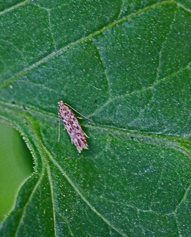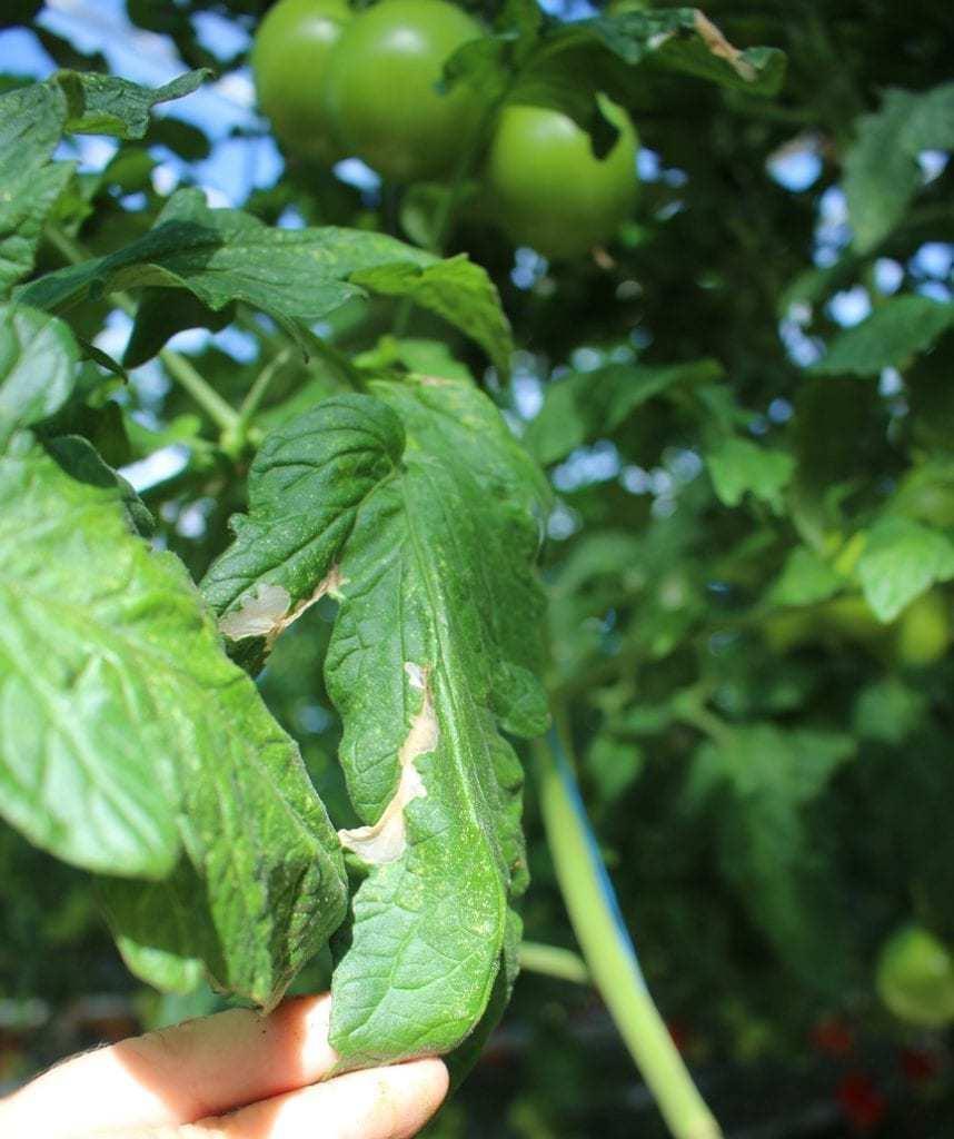 Gąsienice żerują pojedynczo wewnątrz liścia, wyjadając tkankę miękiszową w formie placowej o nieregularnych brzegach. Wewnątrz miny widoczne są czarne grudki odchodów. Uszkodzone liście mają zmniejszoną powierzchnię asymilacyjną, co ma wpływ na wzrost i plonowanie roślin. Poza liśćmi uszkadza łodygi i owoce wgryzając się do wnętrza.