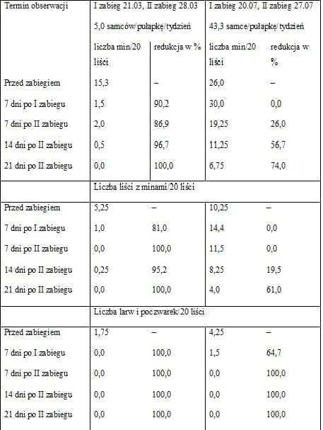 Tabela 1. Ocena skuteczności środka SpinTor 240 SC w stężeniu 0,04% do zwalczania skośnika pomidorowego (Wołowice k/Rawy Mazowieckiej, 2016 r.)