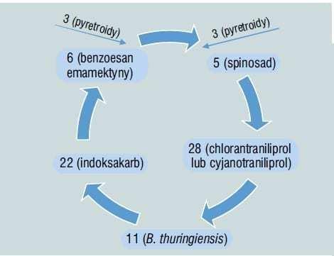 Przykładowa sekwencja kolejności zabiegów w sezonie przeciwko gąsienicom motyli, uwzględniająca środki z grup IRAC o następujących numerach, mogłaby wyglądać tak: