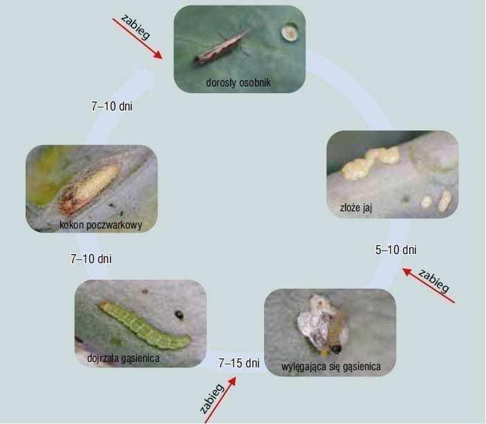 Prawidłowa konstrukcja programu ochrony to nie wszystko. Poszczególne zabiegi trzeba wykonywać uwzględniając konkretną sytuację na danym polu. Zabiegów insektycydowych nie można prowadzić profilaktycznie. Ich charakter musi być interwencyjny, czyli po wystąpieniu szkodnika, dokładnie po przekroczeniu progu szkodliwości. Najefektywniejsze jest zwalczanie gąsienic wczesnych faz rozwojowych, najlepiej bezpośrednio po wylęgu – co jest możliwe, gdy dokładnie lustruje się plantację i obserwuje rozwój wykrytych jaj. Najczęściej jednak zajmują się tym profesjonaliści – doradcy z dziedziny ochrony, analizujący sytuację w danym rejonie. Sygnały od nich wypływające mogą ułatwić decyzję o terminie wykonania zabiegu ochrony. Zniszczenie młodych gąsienic, najlepiej tuż po wylęgu, skutkuje brakiem uszkodzeń rośliny, czyli jest gwarantem dobrej jej jakości (nadgryzione tkanki, nawet mikrouszkodzenia mogą bowiem zwiększyć transpirację, mogą też być drogą infekcji dla patogenów wywołujących np. zgnilizny). Jeśli jednak nie satysfakcjonuje ogrodnika skuteczność pewnej grupy substancji, istnieje prawdopodobieństwo, że wyodrębniła się populacja szkodnika na nią odporna. Wówczas należy na jakiś czas, co najmniej na sezon, zaprzestać używania środków z tej grupy.