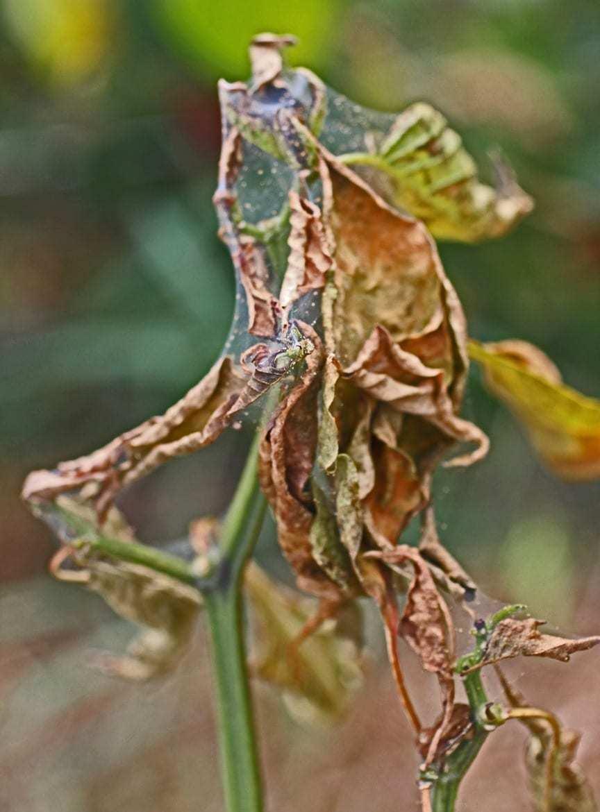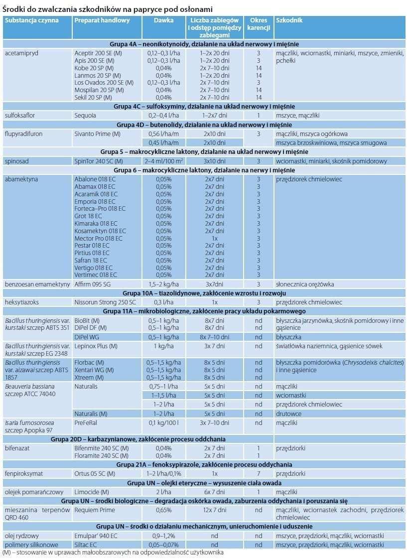 Przędziorek chmielowiec - Tetranychus urticae szczególnie często spotykany jest na roślinach uprawianych pod osłonami, w tym na papryce. Osobniki dorosłe i larwy żerują na dolnej stronie liści opróżniając zawartość komórek miękiszowych. W tych miejscach na górnej powierzchni liścia tworzą się mozaikowate, żółte odbarwienia. Przy dużej liczebności przędziorka liście całkowicie żółkną i opadają, a w warunkach niskiej wilgotności zasnute są przędzą. Samica jest owalna, wypukła, długości 0,4–0,6 mm, żółtozielonkawa z dwiema, ciemnymi plamami po bokach ciała. Larwy są podobne do osobników dorosłych, ale mniejsze i jaśniejsze oraz zamiast 4 mają 3 pary odnóży. Źródłem pojawienia się przędziorka są zimujące samice ukryte w resztkach roślinnych, pod grudkami podłoża, w matach i szczelinach konstrukcji tuneli lub szklarni. Wiosną, gdy temperatura powietrza wzrośnie do 12–13ºC, a długość dnia przekroczy 14 godzin, samice wznawiają aktywność, przechodzą na rośliny i rozpoczynają składanie jaj. Samica w ciągu życia składa 80–110 jaj. Rozwój pokolenia w zależności od temperatury i rośliny żywicielskiej trwa od 10–60 dni. W sezonie wegetacyjnym rozwija się 5–6 pokoleń. W celu wykrycia przędziorka po posadzeniu rozsady co 7–10 dni należy przeglądać dolną stronę liści roślin rosnących w pobliżu rur grzejnych poszukując form ruchomych lub jaj za pomocą 10-krotnie powiększającej lupy. Stwierdzenie kilku roślin z przędziorkiem w różnych miejscach szklarni/tunelu stanowi podstawę do podjęcia decyzji o zwalczaniu. Do zwalczania przędziorka zarejestrowane są środki należące do 7 różnych grup (tabela), co pozwala na przemienne ich stosowanie unikając tym samym odporności. Należy pamiętać, że środek danej grupy powinien być zastosowany dwukrotnie w odstępie 5–7 dni, aby uzyskać całkowite zniszczenie wszystkich stadiów rozwojowych przędziorka.