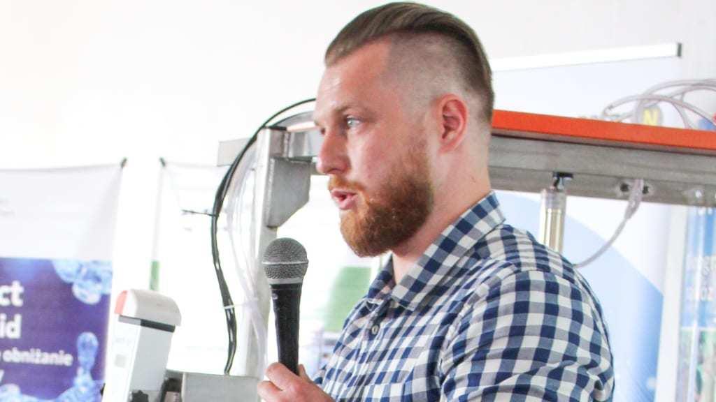 Rafał Szulwic z firmy ULV Polska przybliżył zasadę działania zaprawiarki do ziemniaków Mafex Potato, która pozwala precyzyjnie zaprawić sadzeniaki ultra małą objętością preparatu, bez konieczności jego rozcieńczania lub z użyciem niewielkiej ilości wody. Urządzenie działa bezciśnieniowo i zawdzięcza swoją skuteczność dyszy, której konstrukcja oparta jest na dysku wirowym obracającym się z dużą prędkością (do 18 tys. obrotów na minutę). Ciecz podawana na dyszę wężykami jest silnie rozpylana na krawędziach dysku. Z 1 ml preparatu urządzenie wytwarza 30 do 40 mln kropli, co zapewnia bardzo dobre pokrycie bulw. System Mafex Potato jest mobilny - wystarczy go umieścić nad stołem inspekcyjnym odziemiaczem lub innym urządzeniem powodującym obracanie się bulw ziemniaka, aby zapewnić ich bardzo precyzyjne pokrycie zaprawą. Po zakończeniu zaprawiania można go zdemontować i przenieść do magazynu – informował R. Szulwic.