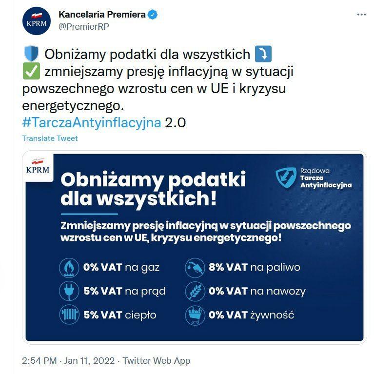 W drugiej tarczy antyinflacyjnej już od 1 lutego na sześć miesięcy, czyli do końca lipca, wdrażamy nowe kolejne rozwiązania. Z 23 proc. na 8 proc. chcemy obniżyć VAT na paliwo. To będzie fundamentalna zmiana cenowa - powiedział premier Mateusz Morawiecki. Według premiera wpływ obniżenia VAT na paliwo na cenę litra paliwa powinien wynieść od 60 do 70 groszy.