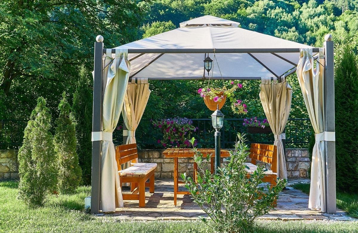 W aktualnych trendach nie mogło zabraknąć pawilonów z materiałowym, prostym lub delikatnie szpiczastym dachem oraz z zasłonami, które nie tylko chronią przed nadmiernym słońcem, ale również nieprzyjemnym wiatrem czy nagłym, zacinającym deszczem.