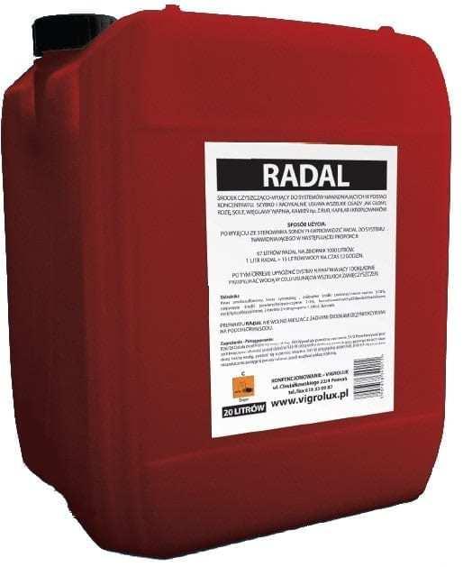 Radal występuje w postaci koncentratu, który mieszamy w odpowiednim stosunku, następnie, po wyjęciu sondy pH, wprowadzamy przez sterownik do instalacji na minimum 12 godzin. W tym czasie Radal działa na wszystkie niepożądane substancje powstałe podczas produkcji. Bardzo ważne jest, aby dokładnie wypłukać układ według następującej kolejności – najpierw otworzyć tzw. „okulary” na końcówkach i wypchnąć wodą Radal wraz z zanieczyszczeniami, następnie zamknąć końcówki i przepłukać system wodą przez kapilary. Czynność tę można powtórzyć dwukrotnie.