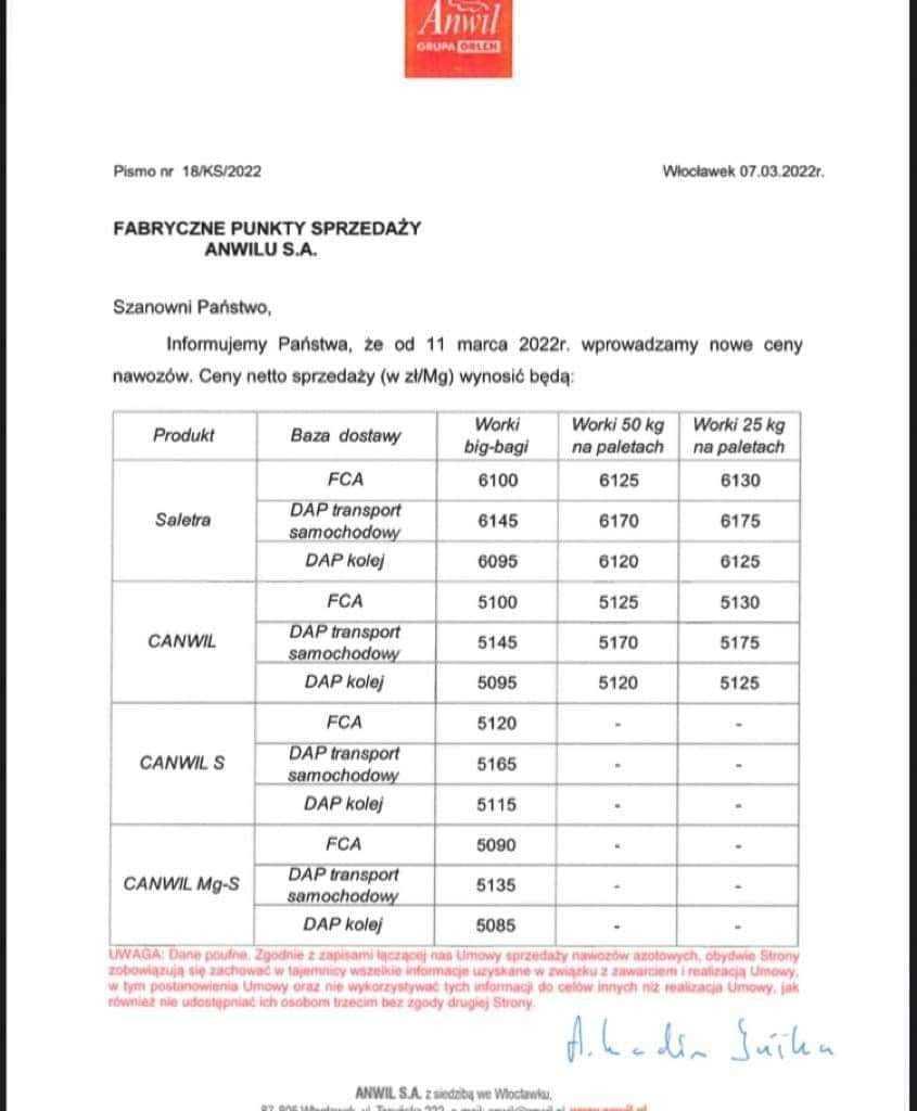 Cena saletry na poziomie ponad 6000 zł jest niewiarygodnie wysoka. Pytanie pozostaje kogo będzie stać na zakup nawozów w takich cenach…