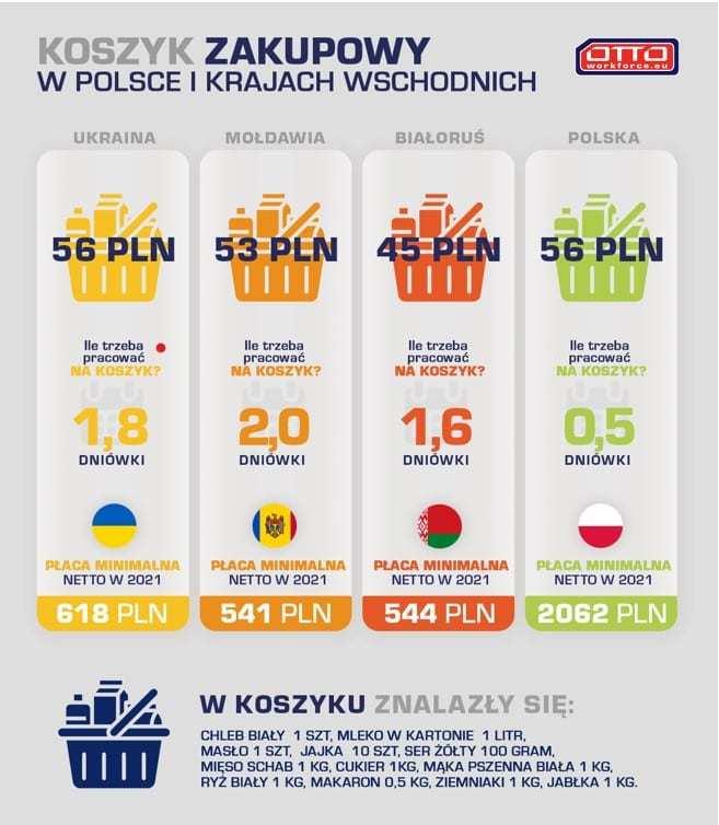 Zarobki na Ukrainie, czy w innych państwach wschodnich, są wciąż niewspółmierne do kosztów życia, dlatego ich obywatele tak chętnie pracują w Polsce. Obecnie płaca minimalna na Ukrainie wynosi około 618 zł netto, podczas gdy w Polsce minimum jakie musi otrzymać pracownik to 2062 zł netto, czyli ponad 3 razy więcej. Z kolei porównanie koszyków zakupowych w Polsce i w krajach wschodnich, opracowane przez OTTO Work Force Central Europe, pokazuje, że koszty utrzymania pozostają na zbliżonym poziomie. W porównywanych koszykach zakupowych znalazły się podstawowe artykuły spożywcze w takich samych ilościach: chleb biały, mleko w kartonie, masło, jajka, ser żółty, schab, cukier, mąka pszenna biała, ryż biały, makaron, ziemniaki, jabłka. Zestawienie pokazuje, że za zakupy podstawowych produktów spożywczych, według uśrednionych cen największych supermarketów w danym kraju, trzeba zapłacić tyle samo na Ukrainie co w Polsce. Oznacza to, że aby zrobić takie same zakupy na Ukrainie trzeba pracować niemal dwa dni, a w Polsce pół dnia. Podobnie sytuacja wygląda na Białorusi i w Mołdawii, tam także widać dużą dysproporcję między poziomem wynagrodzenia a kosztami życia.